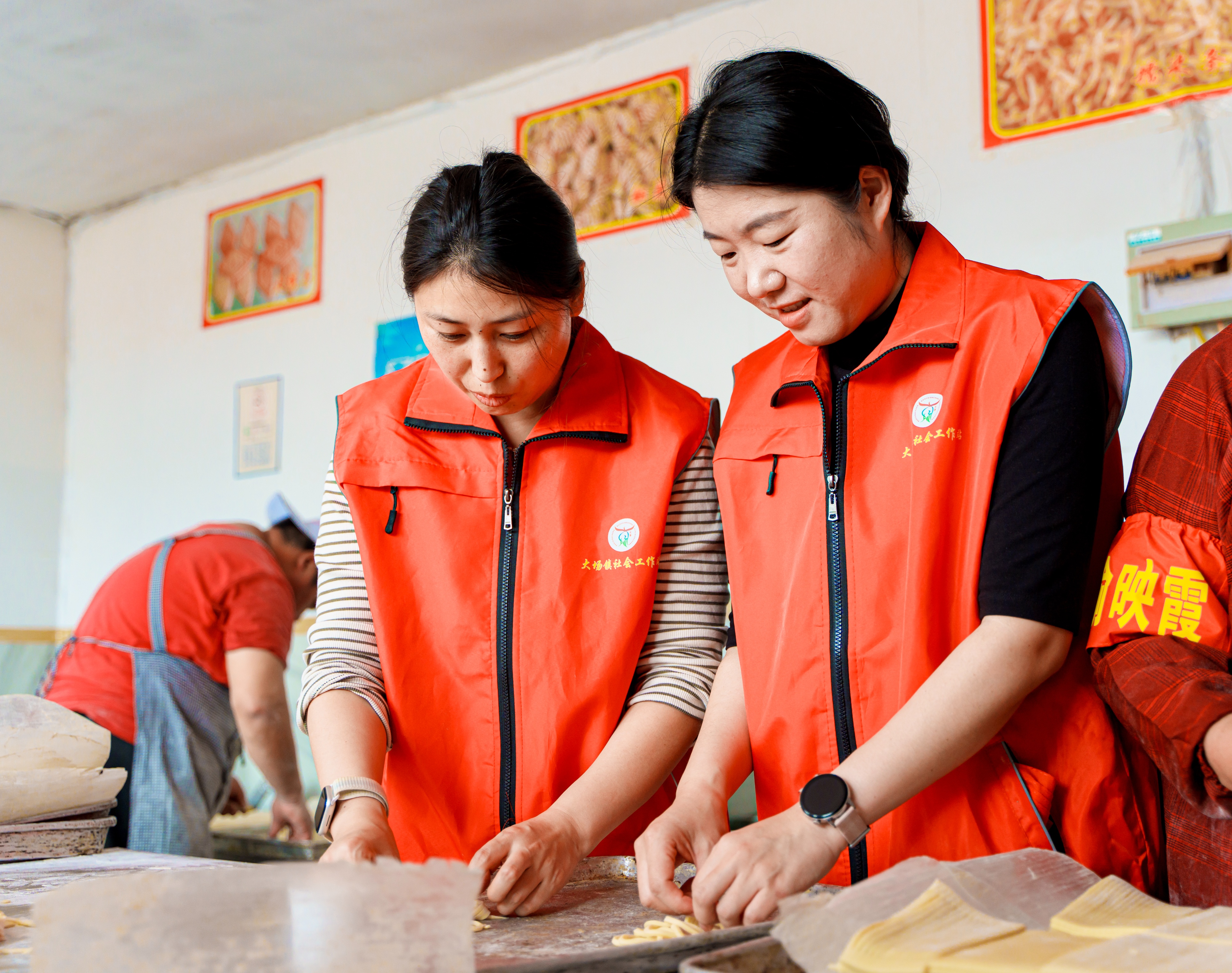 几位身着粉色马甲的大姐围坐桌前,手拿剪刀在红纸上游走,不一会儿,一个个形态各异的“囍”字便跃然纸上。桌上还摆着刚出锅的喜饽饽,麦香十足,在空气里氤氲开来。每一次帮喜前,大家都热热闹闹,心情乐开花。