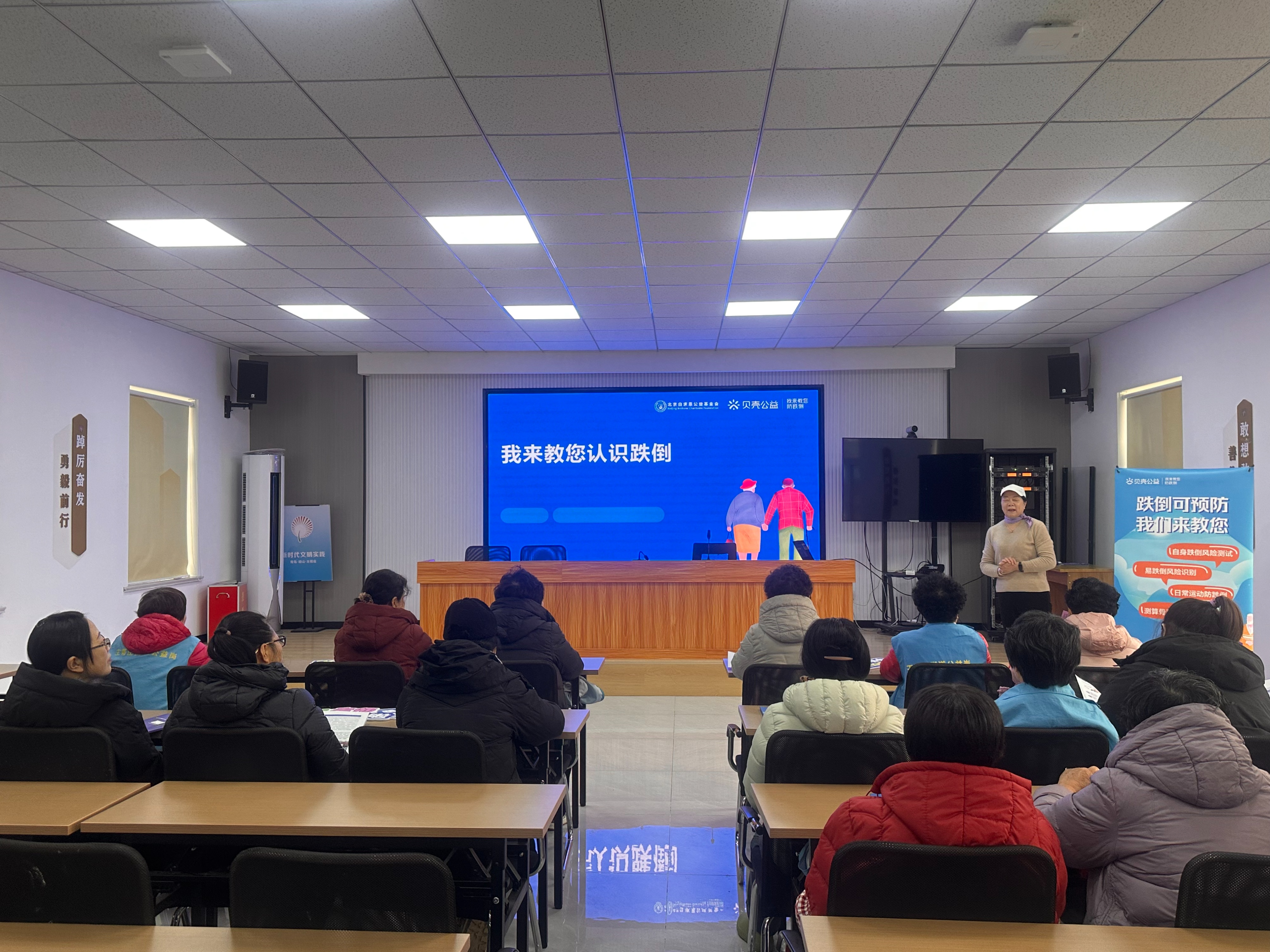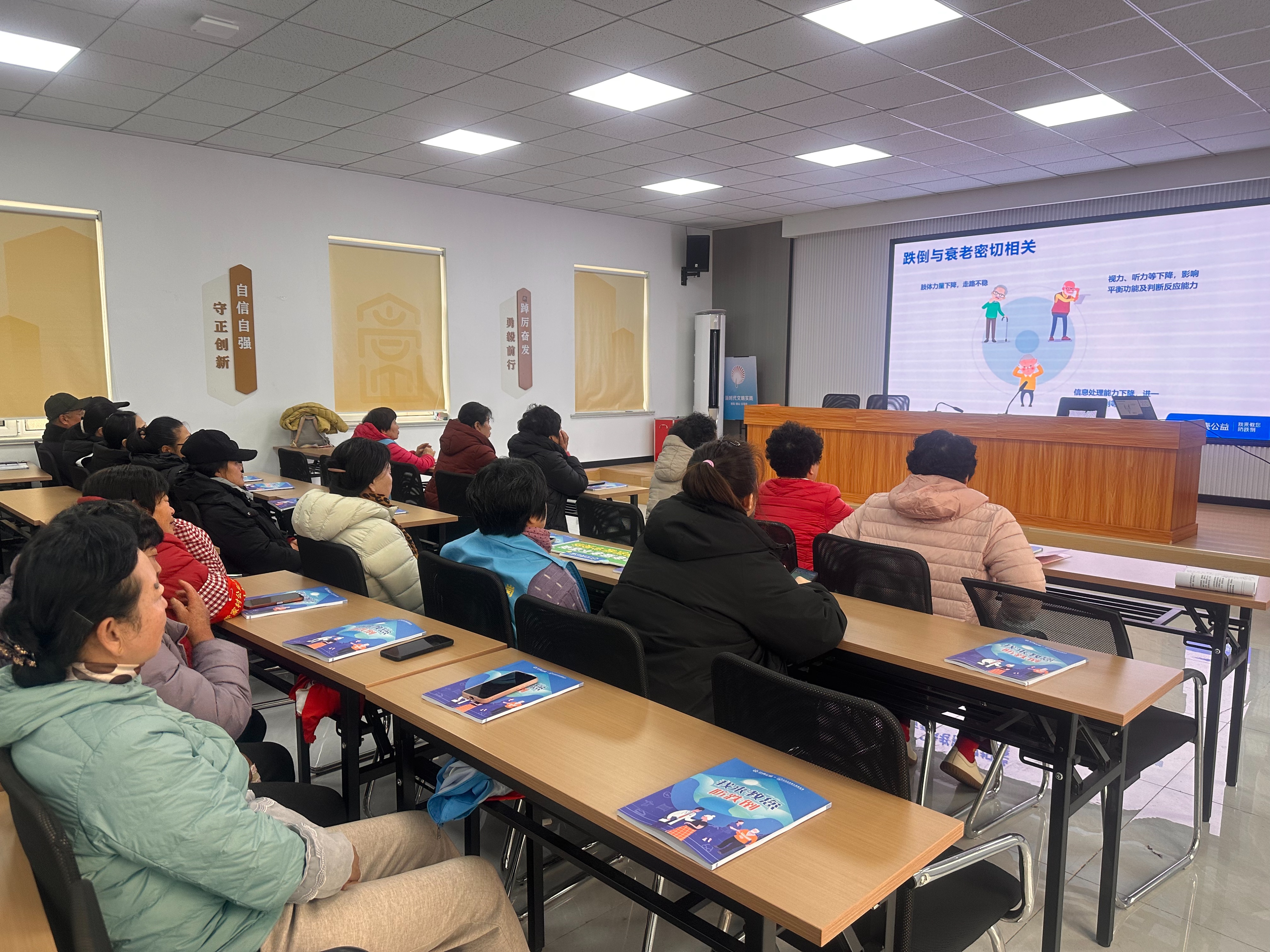 刘主任特别提醒老人们注意家里的细节:“咱村的旱厕,进出有个高台,旁边最好绑个结实的木扶手。”讲到用药安全时,她又举例:“咱村不少老人有高血压、糖尿病,吃着药有时候会头晕。特别是下雨阴天不想出门,可药不能断,突然停药也容易迷糊。这迷糊劲儿一上来,站不稳,最容易摔。”一番话下来,老人们频频点头:“太对了,伤筋动骨一百天,这一跌倒就是个大事,可得好好注意着。”