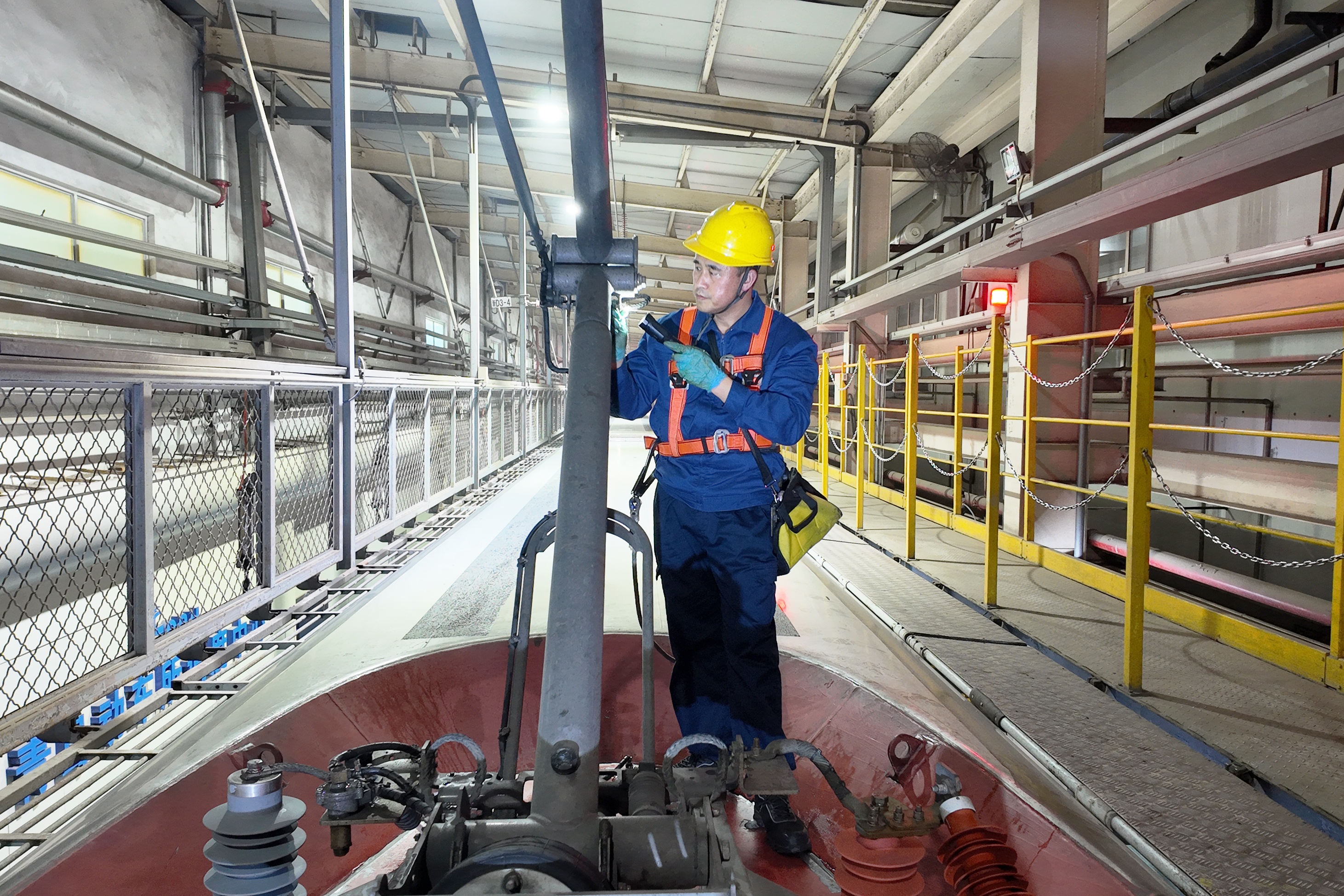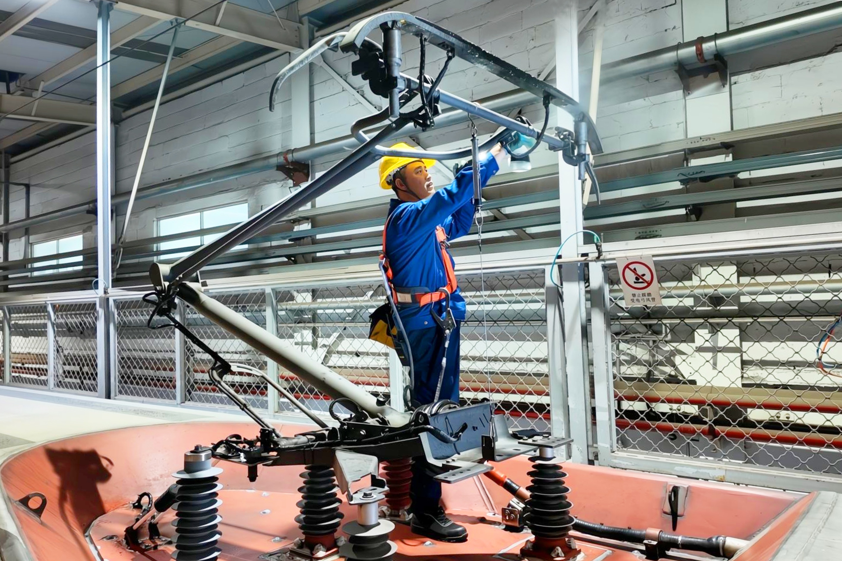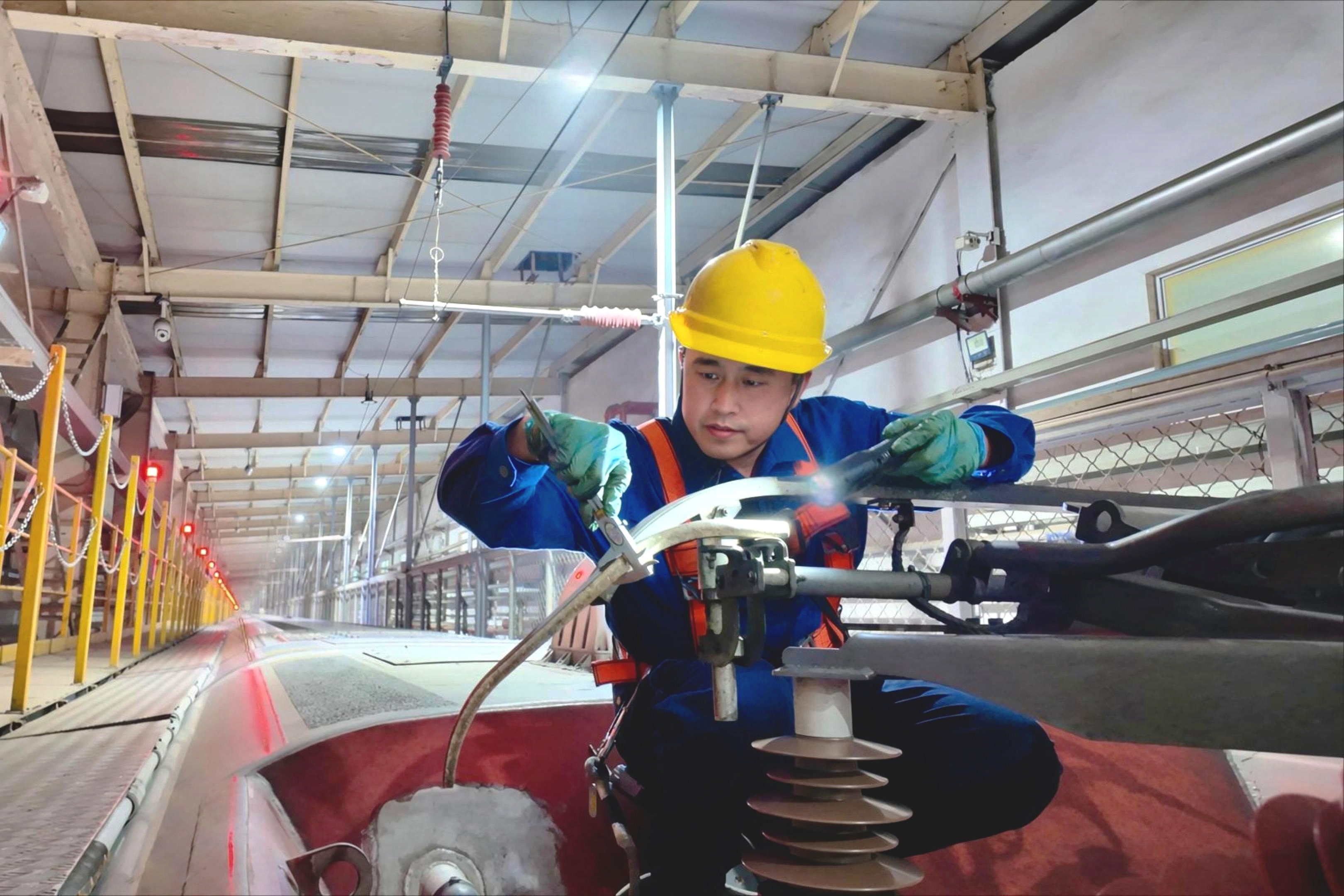 春运期间,全国动车组列车开行密度大幅提升,青岛动车段的检修任务量较日常急剧增加。纪丕辉是受电弓检修的技术骨干,也是五星级标准化规范化作业机械师,他主动扛起夜班重点车次的检修任务。每晚七点,检修库灯火通明,纪丕辉身着工装、系牢安全带,登上数米高的动车组车顶,开启长达数小时的精细化检查。受电弓是动车组的“动力之源”,其运行状态直接关乎行车安全,而春运期间低温、雨雪等恶劣天气频发,对设备稳定性提出了更高要求。作业中,他手持摄像手电,沿着碳滑板、绝缘子、导杆底座等关键部位逐一排查,手电的光束在寒夜里缓缓划过每一颗螺栓、每一寸线缆,对任何一处细微的异常都绝不放过。