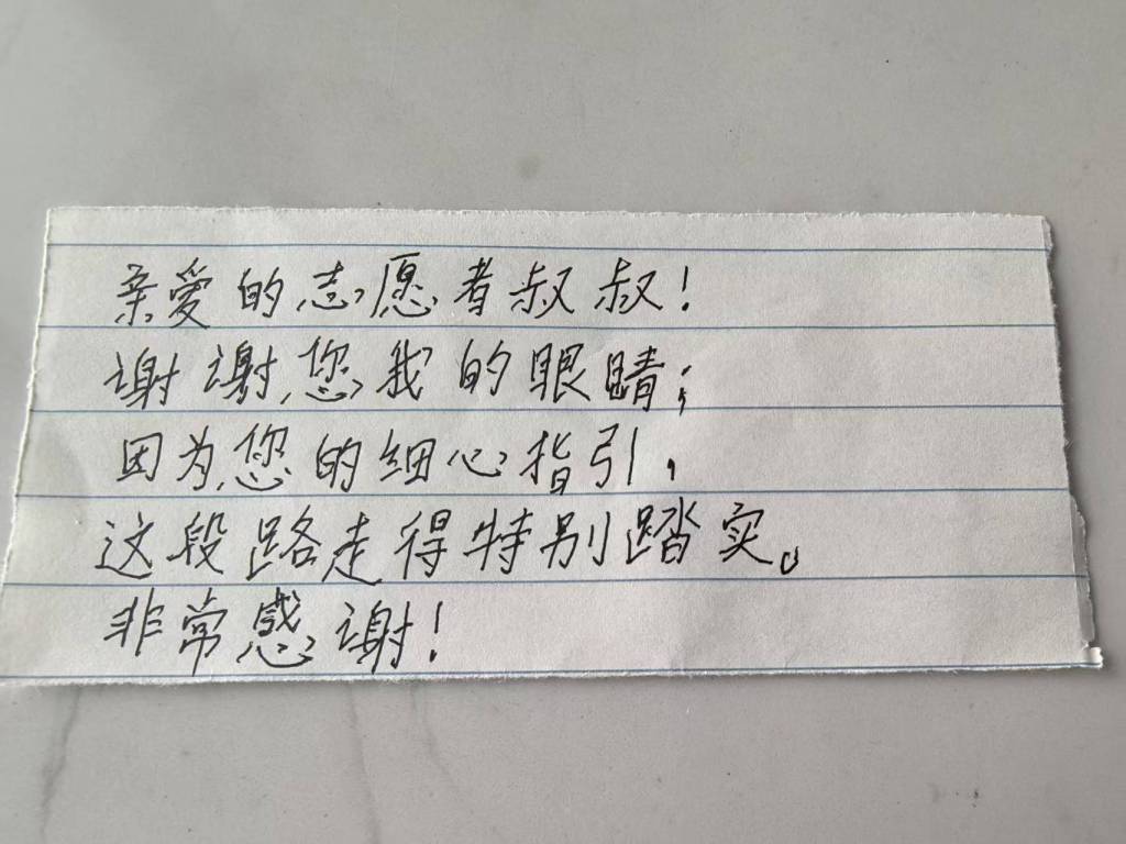 下午4时许,卞涛父子的车稳稳地停在青岛市盲校门口。杜同学下车前,摸索着从包里拿出一封感谢信,递给卞涛,轻声说:“卞叔叔,竣宁哥哥,下学期见。”