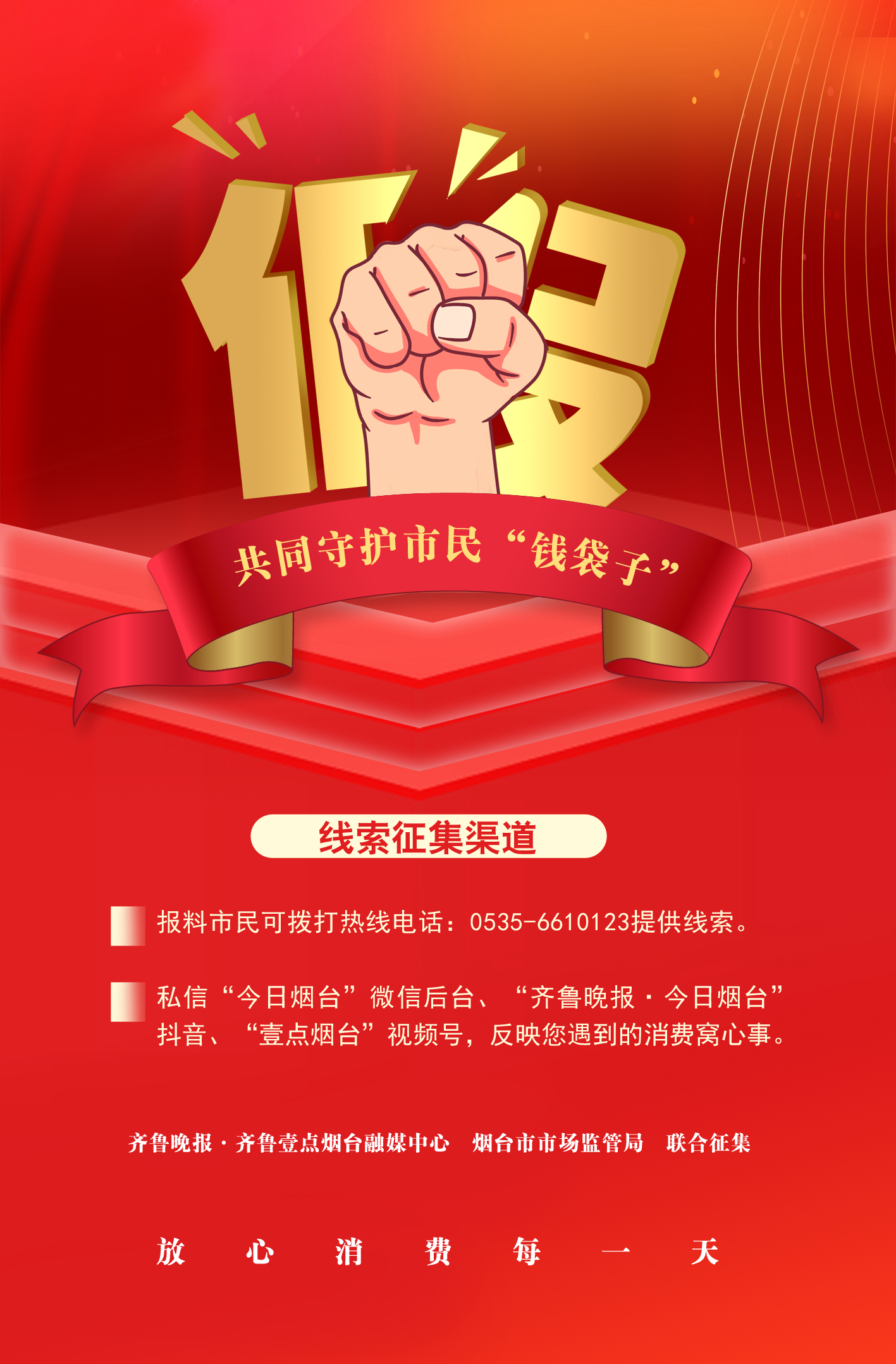 2026年“3·15国际消费者权益日”即将到来,为切实维护广大市民合法权益,净化消费环境,齐鲁晚报·齐鲁壹点烟台融媒中心联合烟台市市场监管局,即日起面向社会公开征集消费侵权线索,共同守护市民“钱袋子”。