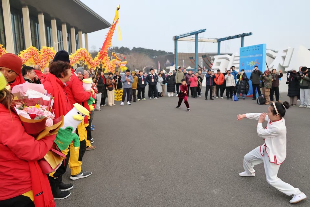 没有预告,不设舞台。正当人群熙攘之际,一曲《刀剑如梦》的笛声随海风响起,瞬间吸引众人目光。笛音未落,两位武者提刀持剑,跃步上前,刀剑交击,引来阵阵喝彩。紧接着,省级非物质文化遗产——太极梅花螳螂拳的传承者飒爽亮相,刚柔并济的招式,令人目不暇接。从笛声到刀剑再到太极梅花螳螂拳,一连串充满侠气的节目,在十几分钟里密集呈现,为刚刚靠岸的“青岛号”船员与在场市民游客,献上了一场极具中华文化特色的视觉盛宴。它将非遗表演从传统展厅移至国际赛事码头前沿,在克利伯帆船赛这一世界级平台上,实现了文化展示与城市迎宾的巧妙融合,让远方的客人在踏上青岛的第一时间,便能感受到青岛独有的文化活力与友好情谊。