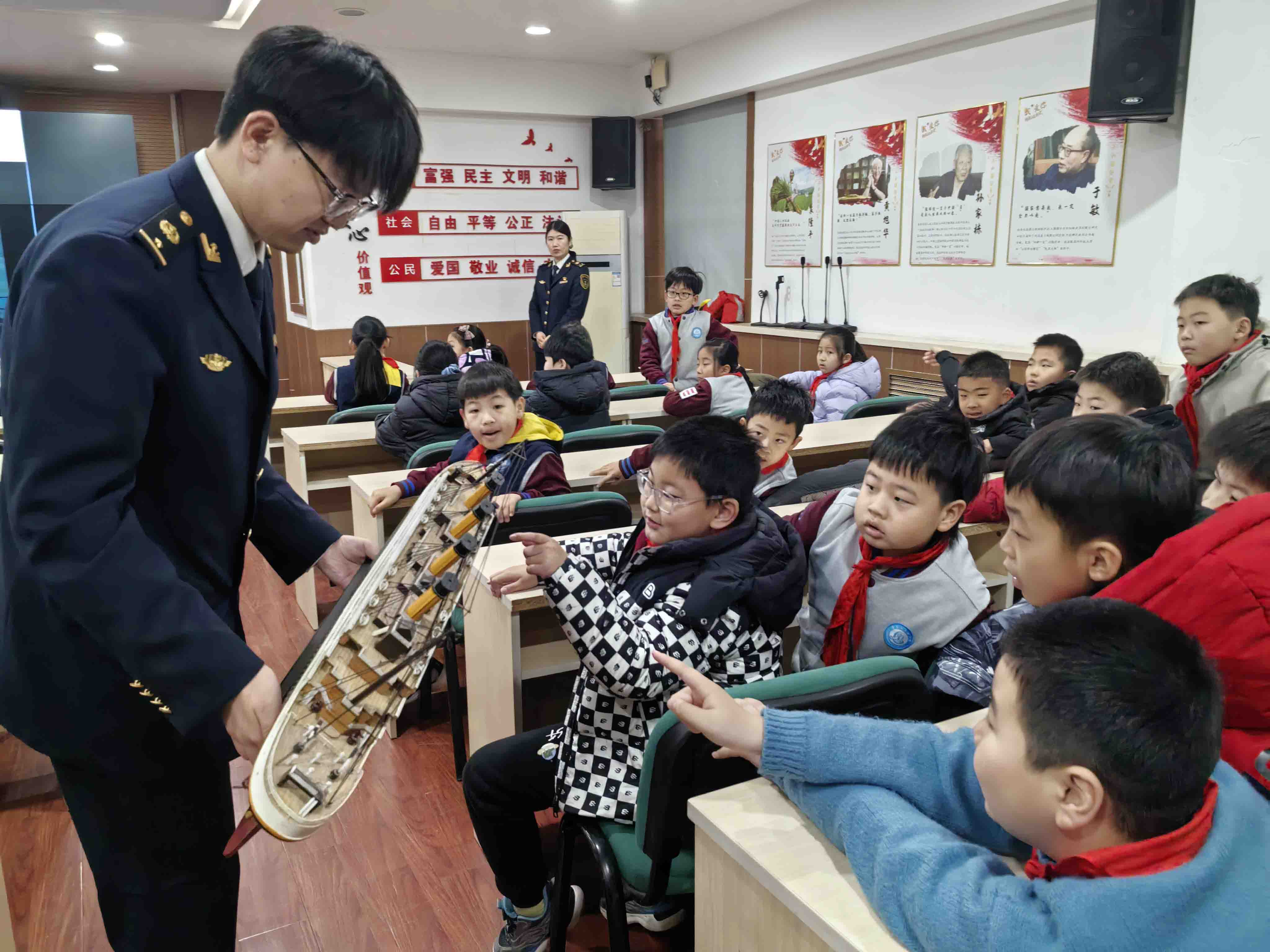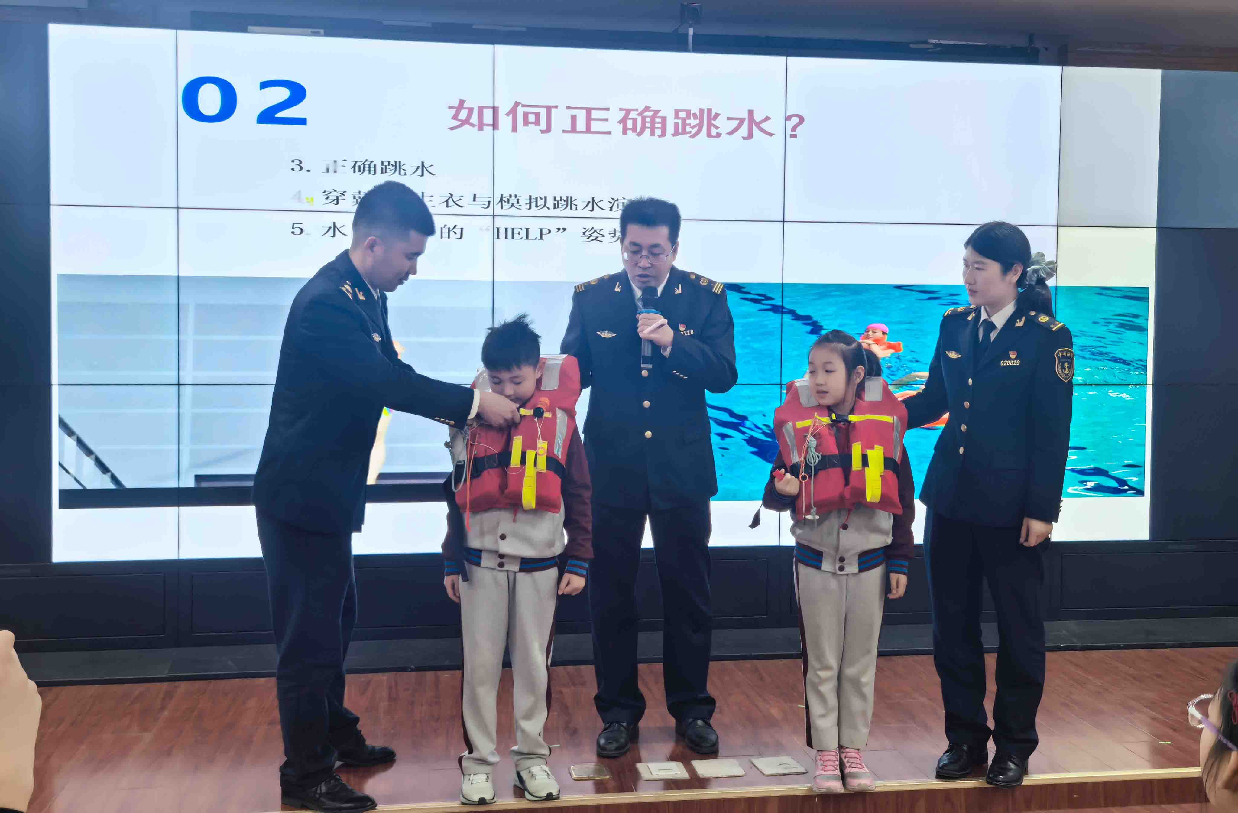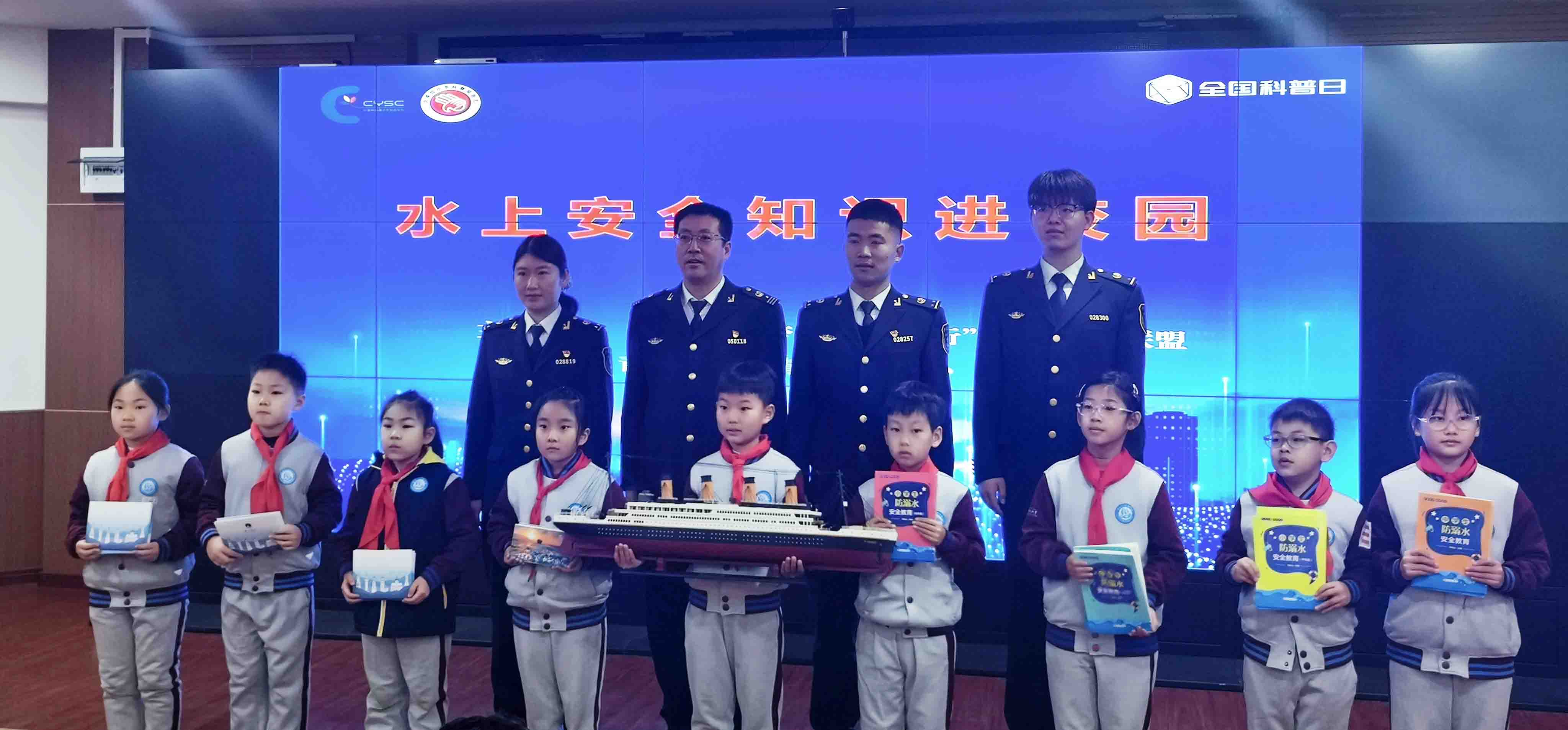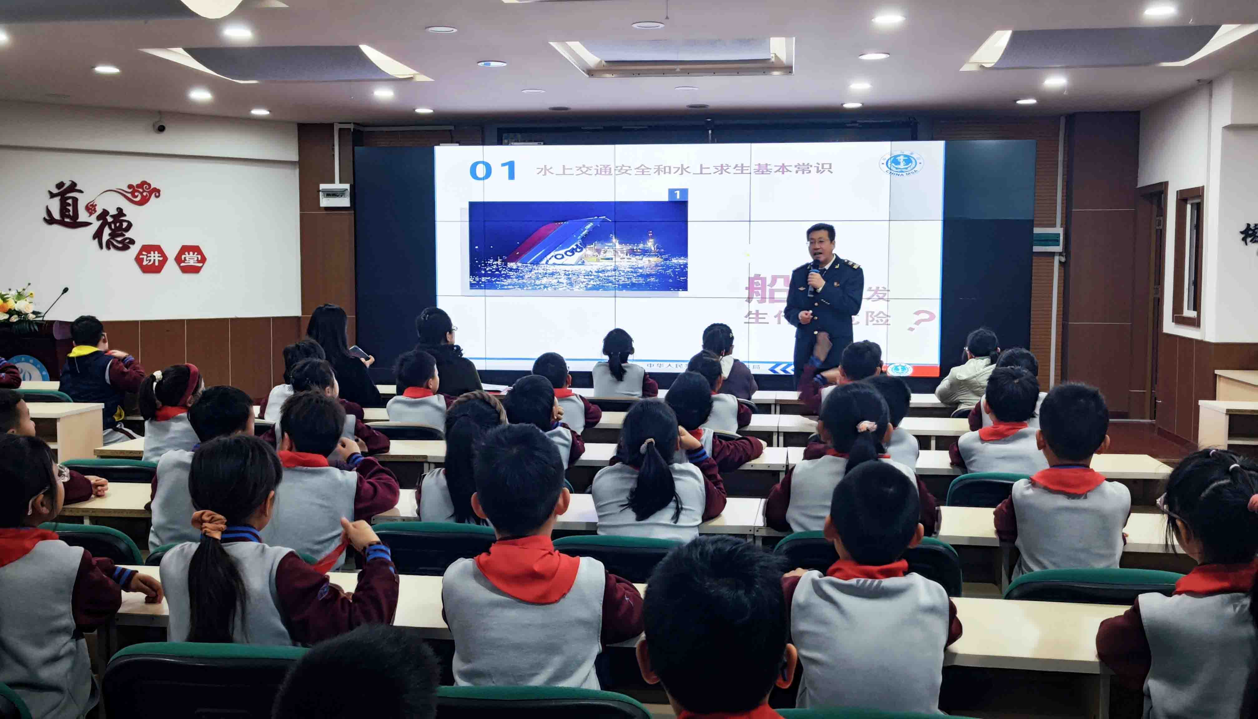 “船在海上可能发生什么危险?客船遇险如何逃生求生? 海上漂流如何获取淡水和食物?”“人在零度的水里能活多久? 对失温的人该如何正确施救”“什么是离岸流?如何逃脱离岸流?”“小伙伴意外落水如何正确施救……”海事志愿者结合《泰坦尼克号》《少年派的奇幻漂流》等经典电影和典型案例,视频加互动、理论加模拟演练,讲授水上求生、急救、乘船安全等基本安全常识和航海科普知识,并以贴近生活的案例,深入剖析了事故原因和教训,教授学生进行水上遇险后的自救和施救、发生溺水事故后的应急处置等,为学生带来了一场精彩生动的“水上安全和防溺水”技能培训,并向学校赠送了《小学生水上安全防溺水》书籍、精美的航海科普卡片等礼物。一个小时的讲座,学生们全程高能互动,兴致满满。