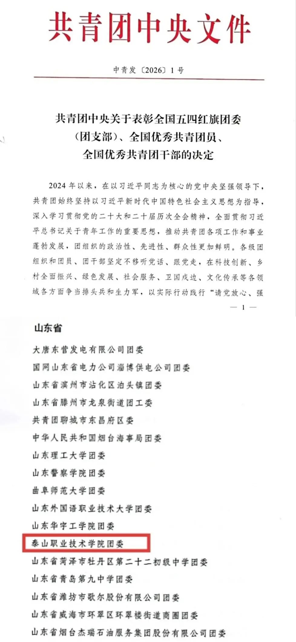 近日,共青团中央公布《关于表彰全国五四红旗团委(团支部)、全国优秀共青团员、全国优秀共青团干部的决定》,泰山职业技术学院团委获评“全国五四红旗团委”称号。