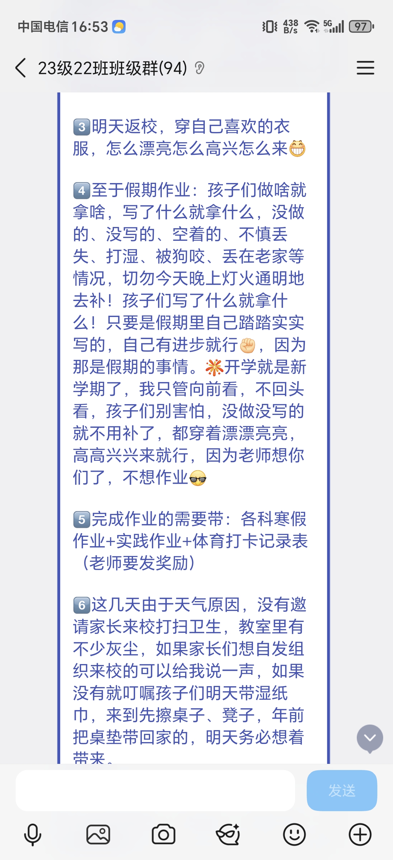 开学前一天,3月4日8时55分,班主任程彦梅老师在班级群里@所有人,“诚挚邀请三年级22班所有小殿下参加开学大典”。她写到:“至于假期作业:孩子们做啥就拿啥,写了什么就拿什么,没做的、没写的、空着的、不慎丢失、打湿、被狗咬、丢在老家等情况,切勿今天晚上灯火通明地去补!孩子们写了什么就拿什么!只要是假期里自己踏踏实实写的,自己有进步就行,因为那是假期的事情。开学就是新学期了,我只管向前看,不回头看,孩子们别害怕,没做没写的就不用补了,都穿着漂漂亮亮,高高兴兴来就行,因为老师想你们了,不想作业”。