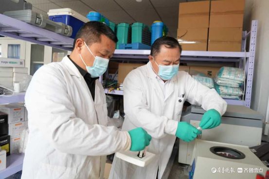 ▲孙树民(右)做采集的牛羊猪鸡全血分离血清工作