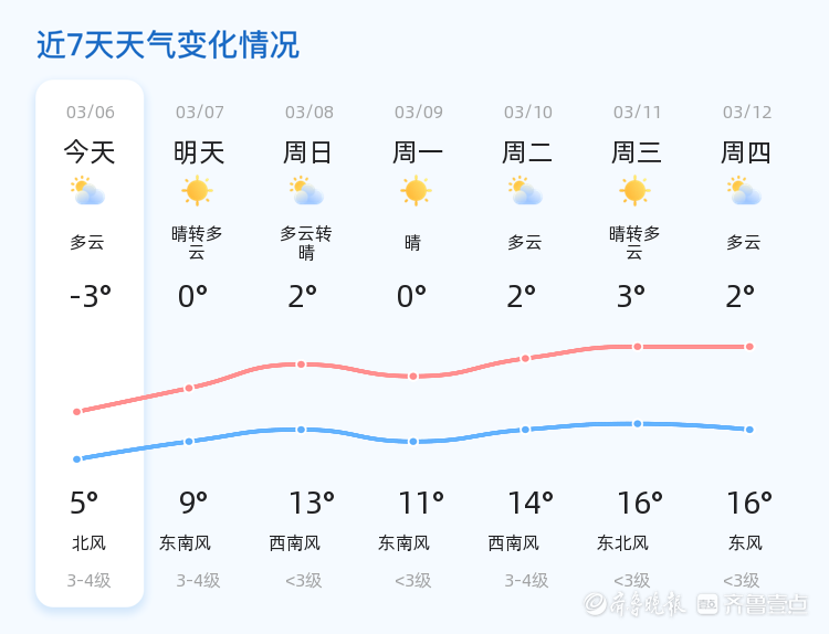 未来三天,滨州天气趋势总体平稳,气温逐步回升,预计最高气温可达13℃,最低气温-3℃。周末两天天气晴朗,适宜户外活动。提醒市民根据天气变化适时增减衣物,注意保暖。