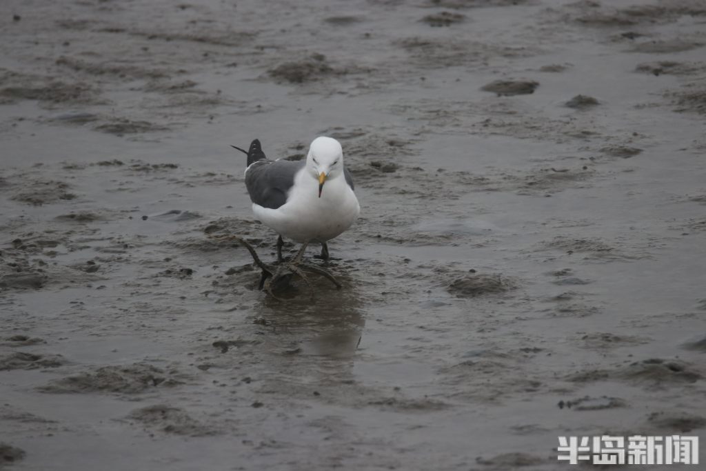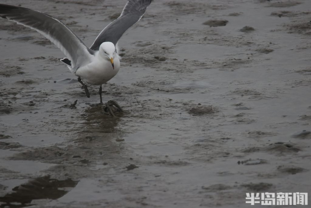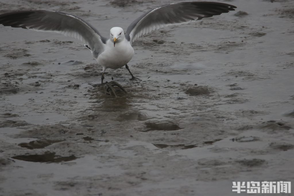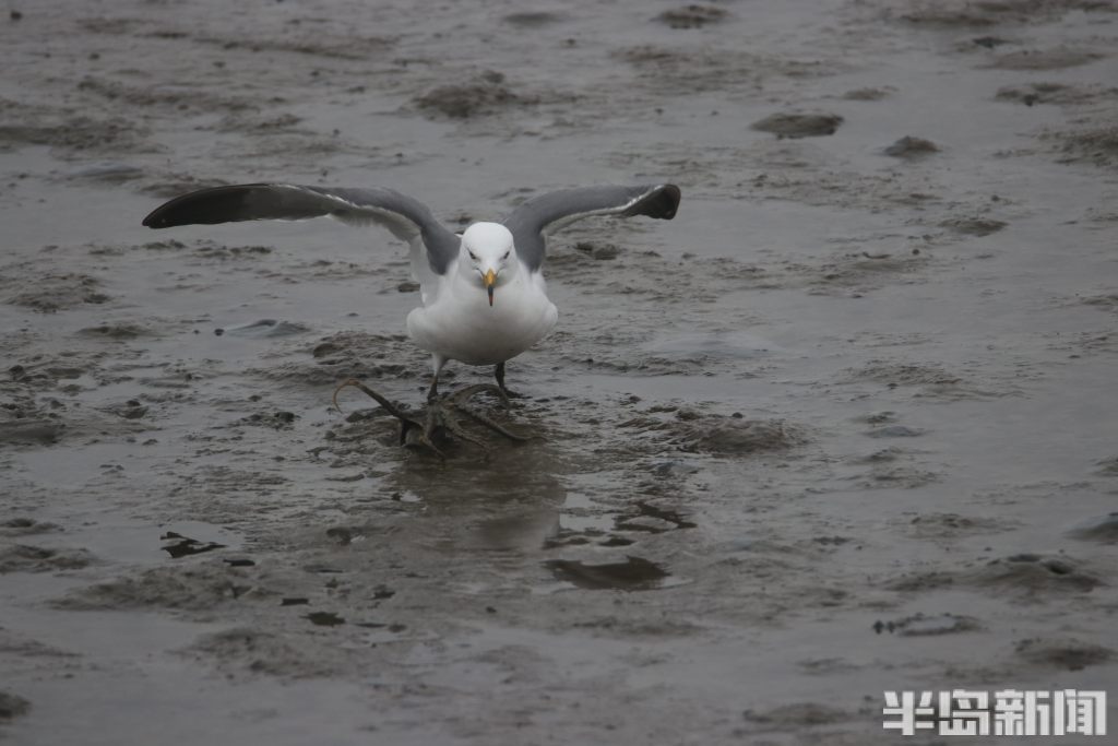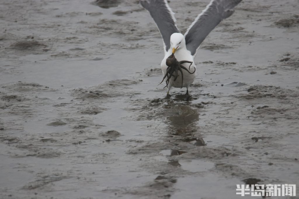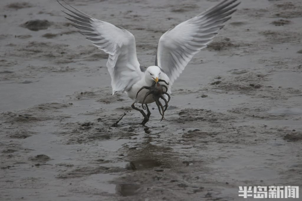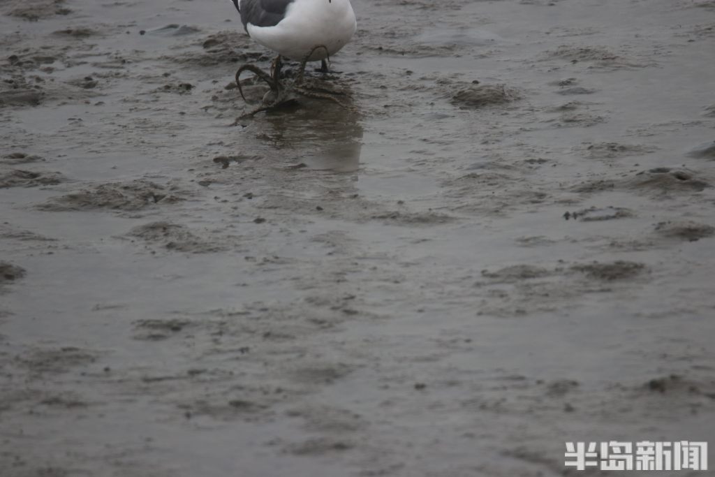 3月5日,在青岛胶州湾沧口海滩上,海鸥觅食逮到一个八带。双方在滩涂上展开拉锯战,海鸥挥舞翅膀叼着八带想吞下肚,八带则拼命挣扎,挥动八爪乱舞,双方僵持不下。海鸥见难以下咽,将其吐到滩涂上,双方陷于对峙。八带继续张牙舞爪示威,数回合之后,竟然将海鸥吓跑了!八带则迅速遁地逃之夭夭……(半岛全媒体记者黄杰显)