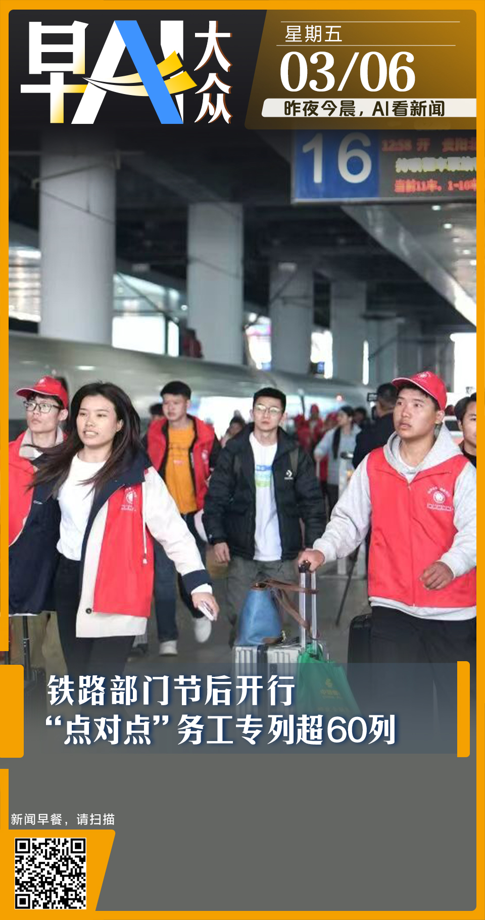 记者从国铁集团获悉,针对节后务工人员出行高峰,铁路部门多措并举,强化运力供给和站车服务,保障务工人员平安有序返岗。详情>>