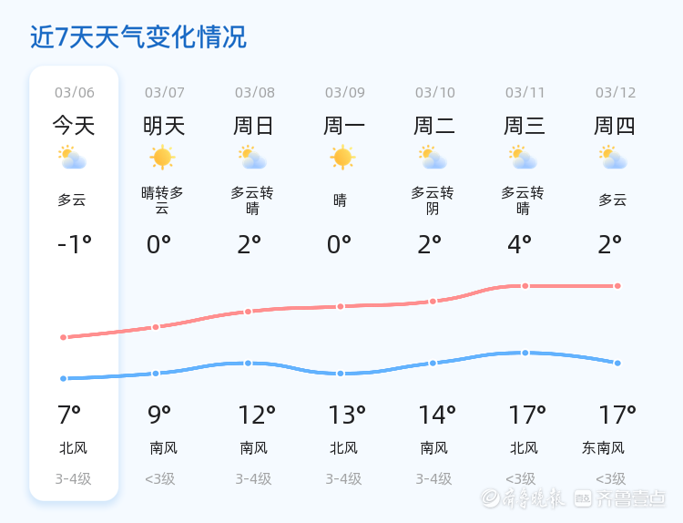 未来三天,泰安市天气以多云为主,气温将继续回升,最高气温可达12℃,最低气温-1℃。其中,周日和下周一风力较大,为南风3-4级,市民出行时需注意防风保暖。此外,周三至周四天气以多云为主,气温维持在4℃至17℃之间,风力较小,适宜户外活动。
