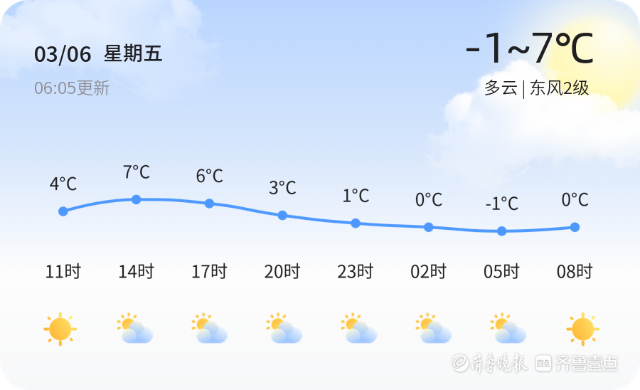 今天是3月6日,星期五,农历正月十八。泰安市今日天气多云,气温在-1℃至7℃之间,目前实时气温0.2℃,东风2级,空气湿度81%,PM2.5指数5一致,均为多云天气,温差不大,整体较为温和。