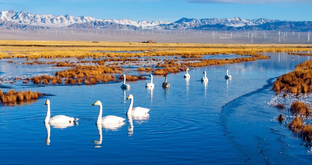 2025年11月14日,甘肃阿克塞县,大天鹅在小苏干湖湿地游弋觅食。本文图/新华