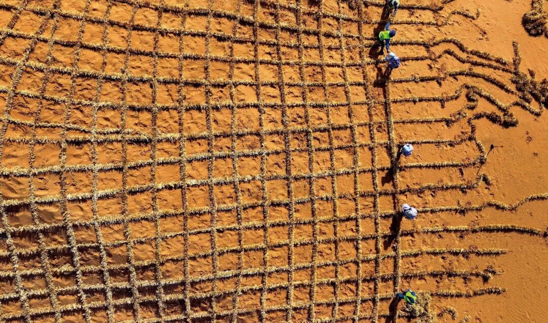 2024年5月30日,治沙工人在宁夏中卫市境内的腾格里沙漠铺设刷状网绳式草方格沙障。