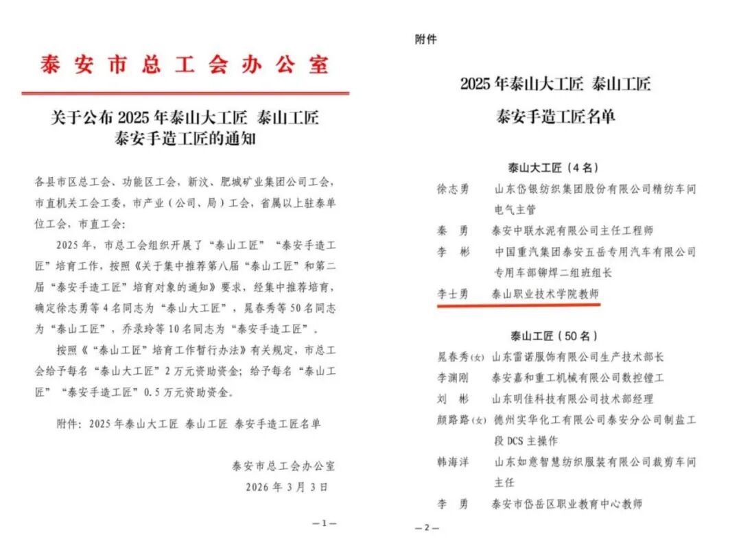 近日,泰安市总工会公布了第八届“泰山大工匠、泰山工匠、泰安手造工匠”推荐培育名单,泰山职业技术学院教师李士勇获第八届“泰山大工匠”荣誉称号。