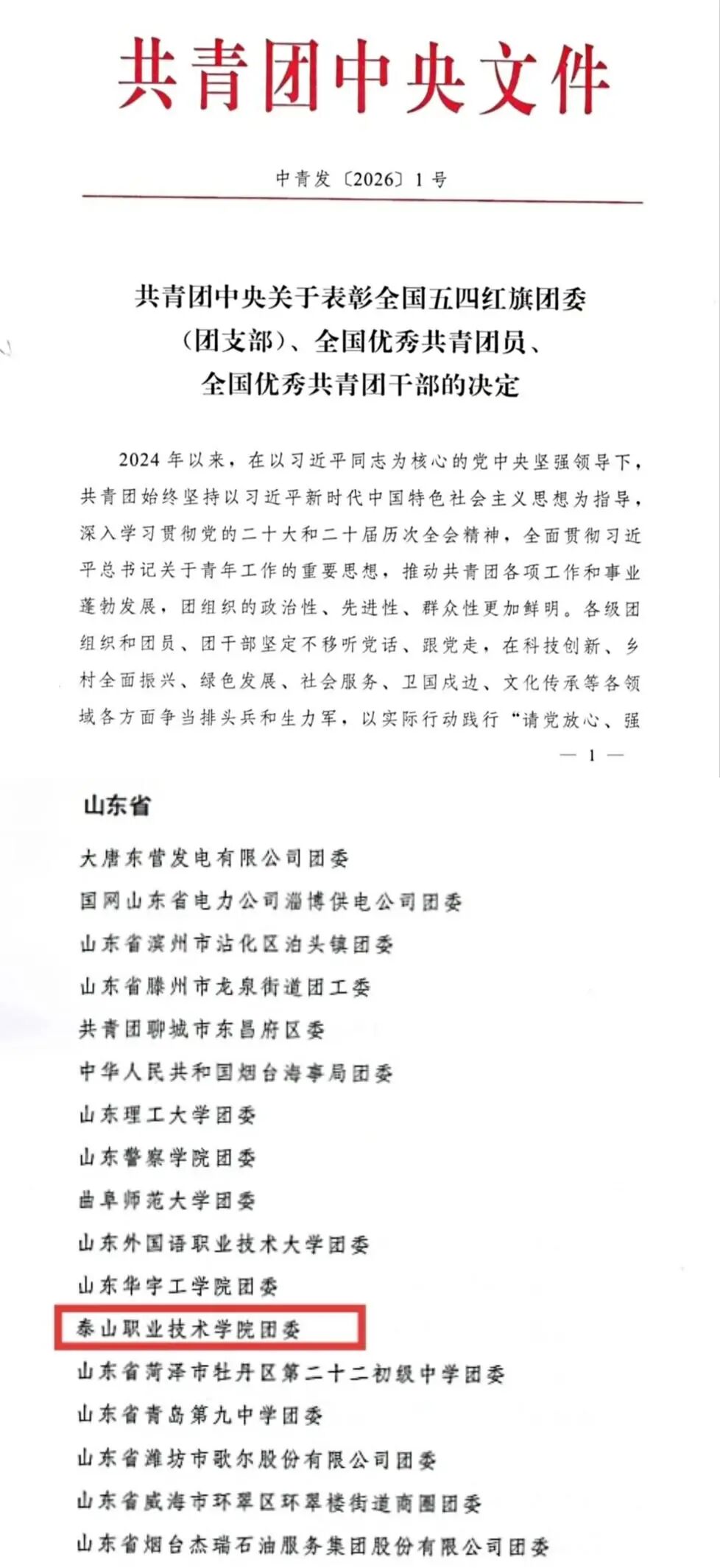 近日,共青团中央公布《关于表彰全国五四红旗团委(团支部)、全国优秀共青团员、全国优秀共青团干部的决定》,泰山职业技术学院团委获评“全国五四红旗团委”称号。