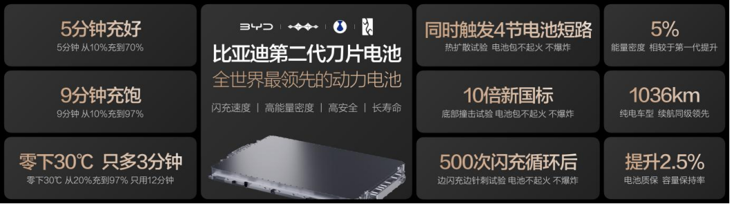 要解决这些根源性问题,关键看电池。六年磨一刀,比亚迪正式推出第二代刀片电池,带来了颠覆性的闪充体验,实现“常温充电,5分钟充好,9分钟充饱;低温充电,零下30度,只多3分钟”,让充电和加油一样快,超越过往,前所未有。
