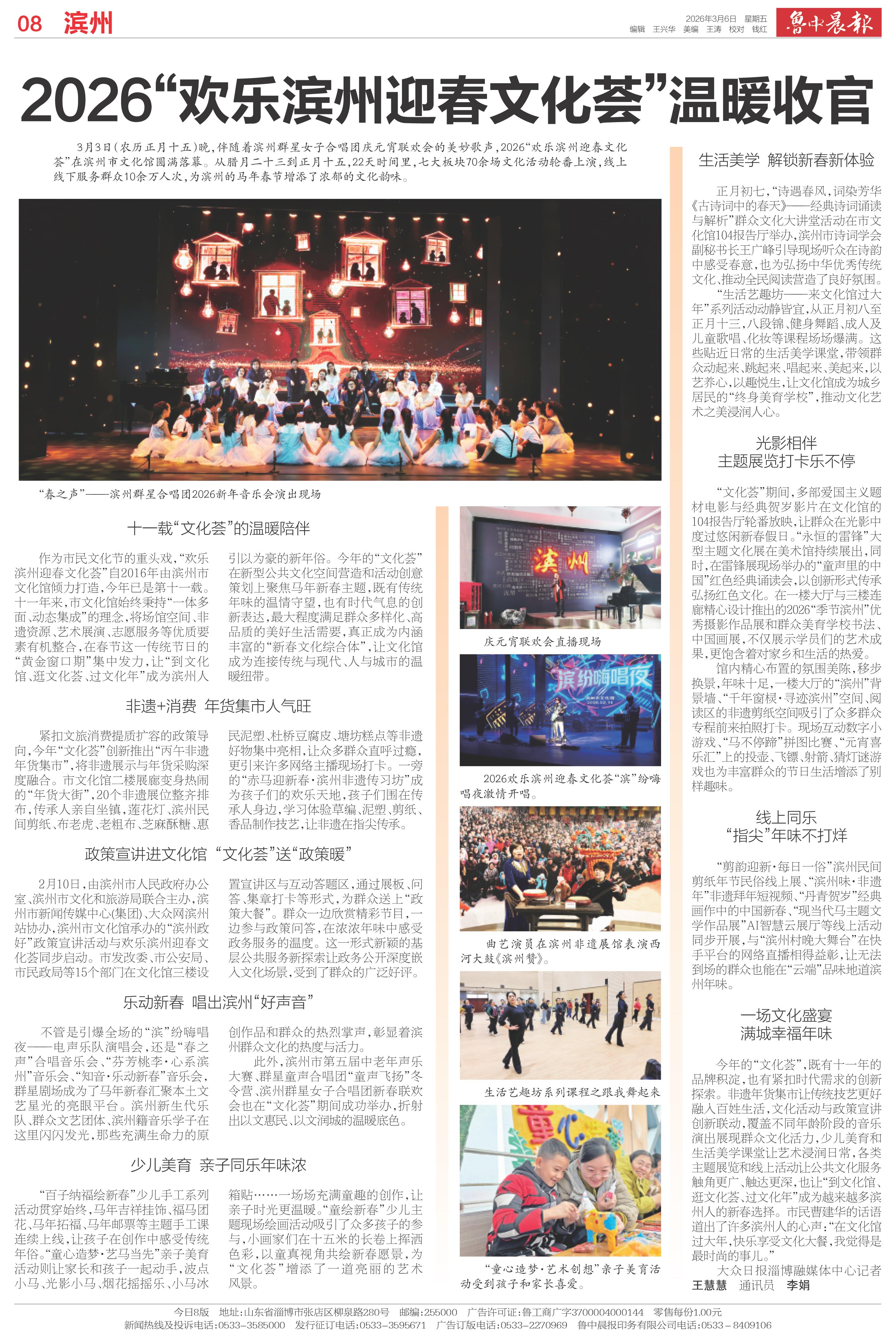 3月3日(农历正月十五)晚,伴随着滨州群星女子合唱团庆元宵联欢会的美妙歌声,2026“欢乐滨州迎春文化荟”在滨州市文化馆圆满落幕。从腊月二十三到正月十五,22天时间里,七大版块70余场文化活动轮番上演,线上线下服务市民群众十余万人次,为滨州的马年春节增添了浓郁的文化韵味。