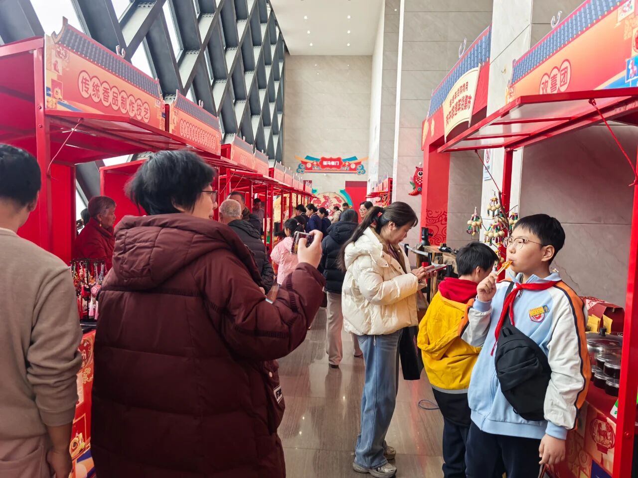 紧扣文旅消费提质扩容的政策导向,今年“文化荟”创新推出“丙午非遗年货集市”,将非遗展示与年货采购深度融合。二楼展廊变身热闹的“年货大街”,20个非遗展位整齐排布,传承人亲自坐镇,莲花灯、滨州民间剪纸、布老虎、老粗布、芝麻酥糖、惠民泥塑、杜桥豆腐皮、塘坊糕点等非遗好物集中亮相,让众多市民直呼过瘾,更引来许多网络主播现场打卡。一旁的“赤马迎新春·滨州非遗传习坊”成为孩子们的欢乐天地,孩子们围在传承人身边,学习体验草编、泥塑、剪纸、香品制作技艺,让非遗在指尖传承。