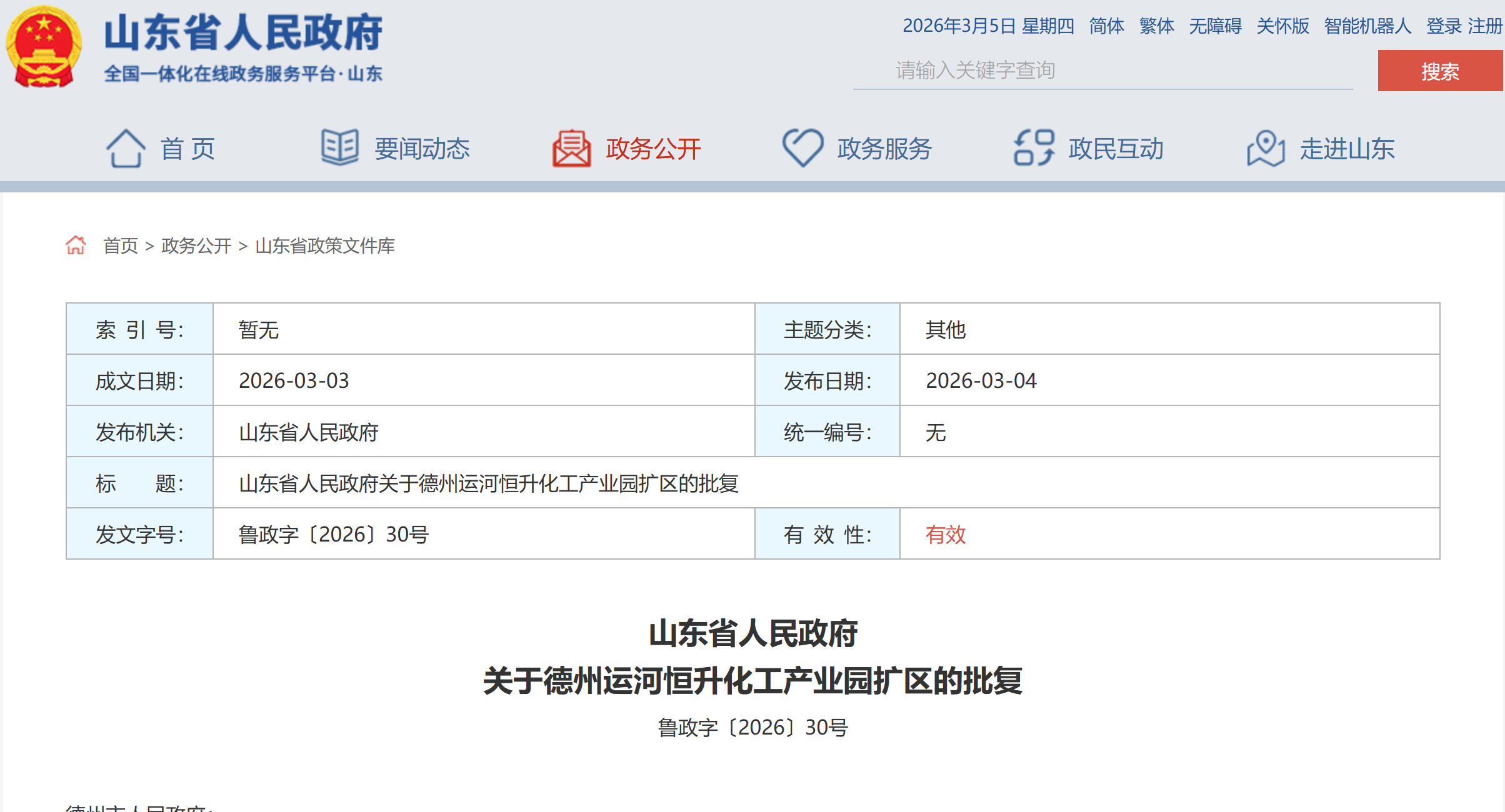 山东省政府批复,同意德州运河恒升化工产业园扩大核准面积