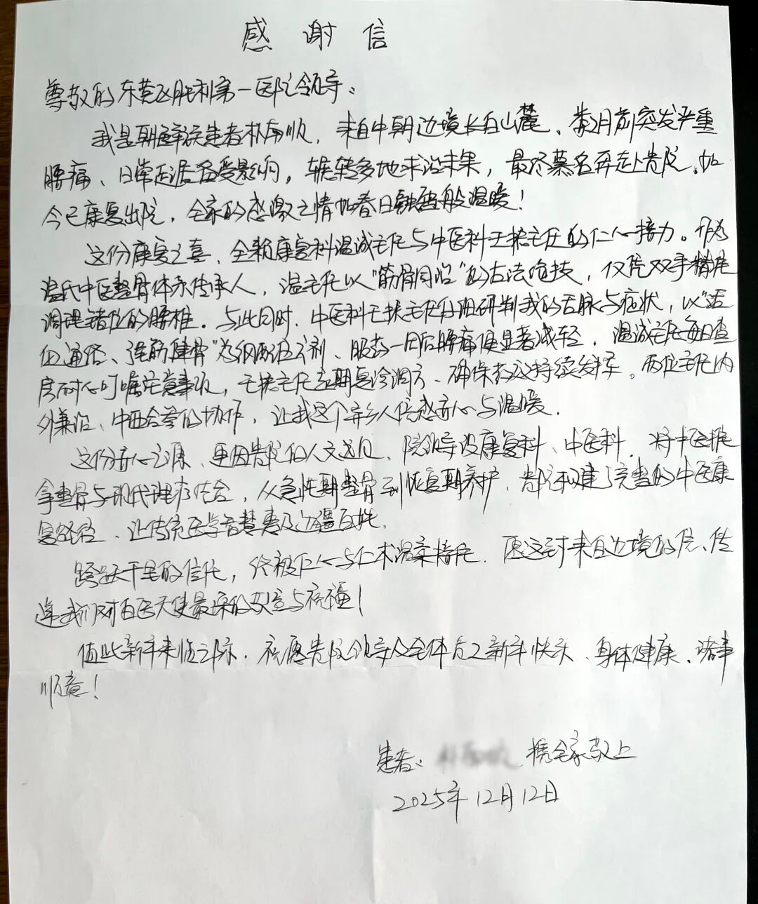 手写的文字最真诚,朴素的感谢最动人。不久前,东营区胜利第一医院收到一封跨越山海的感谢信。信中,来自长白山麓的朝鲜族同胞朴女士,用真挚的笔触,诉说着对医院康复科温诚主任、中医科王振主任及全体医护人员的感激之情。