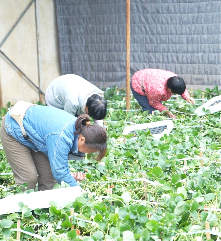 馥羽草莓文化产业园内正在采摘草莓的员工。