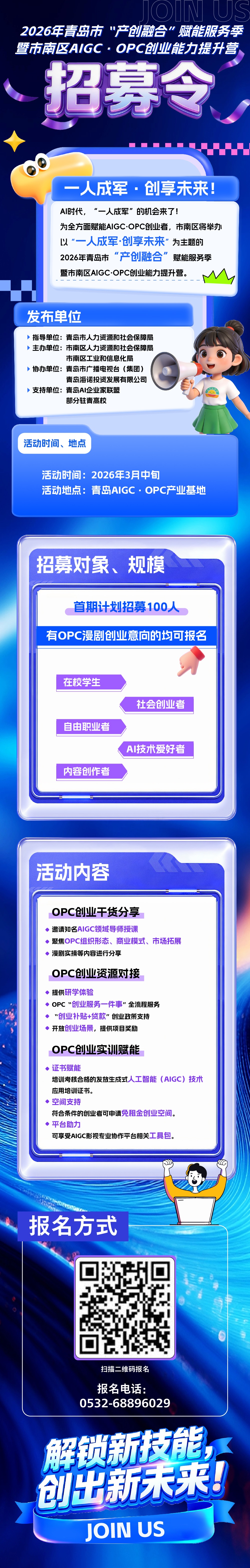 AI时代,“一人成军”的机会来了!为全方面赋能AIGC·OPC创业者,青岛市南区将举办以“一人成军·创享未来”为主题的2026年青岛市“产创融合”赋能服务季暨市南区AIGC·OPC创业能力提升营。