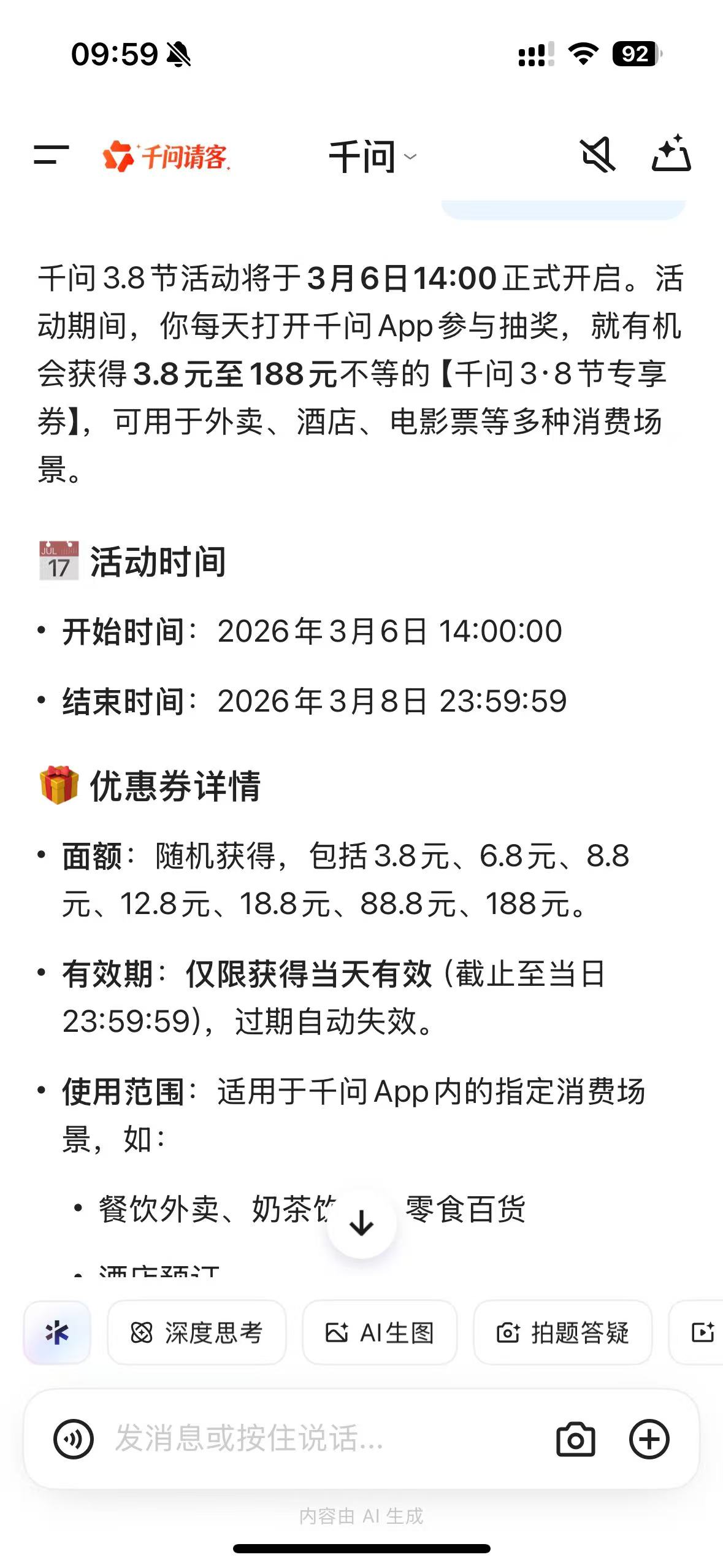 于是,记者在千问APP输入“38妇女节活动”关键词,则显示千问3.8节活动将于3月6日14:00正式开启。活动期间,你每天可打开千问App参与抽奖,有机会获得3.8元至188元不等的【千问3·8节专享券】,可用于外卖、酒店、电影票等消费场景。活动开始时间:2026年3月6日 14:00:00,结束时间:2026年3月8日 23:59:59。