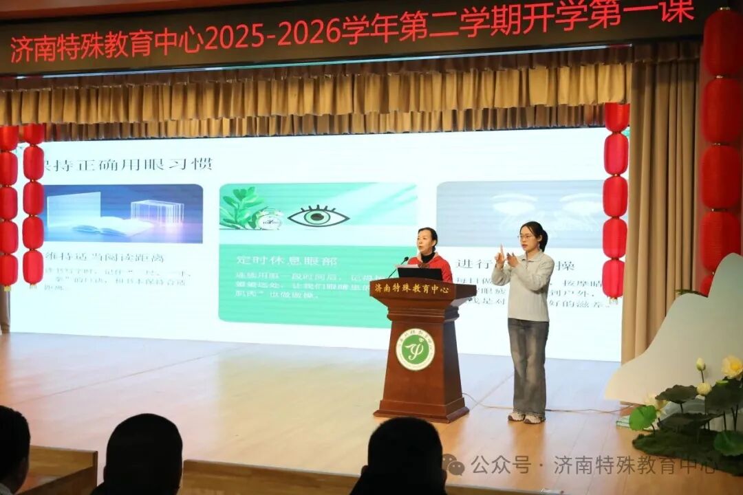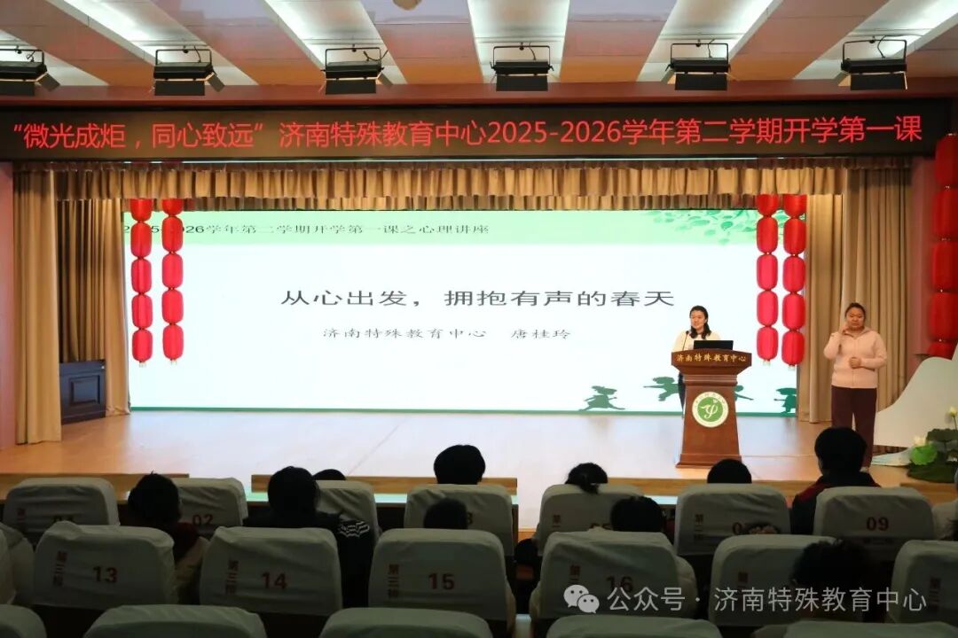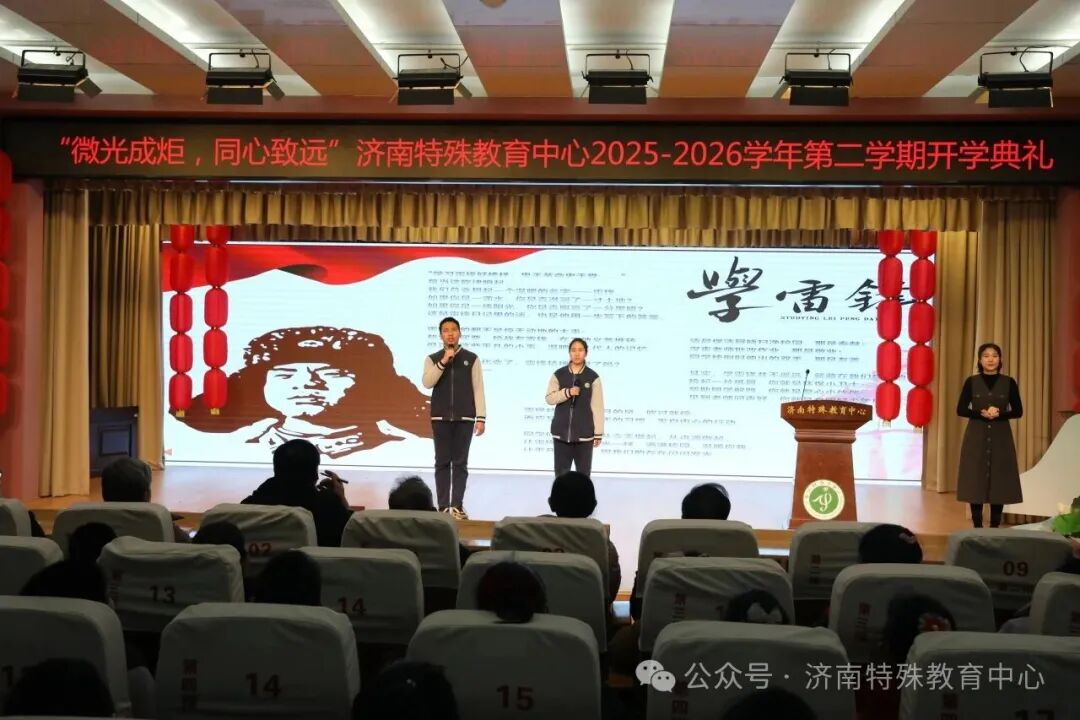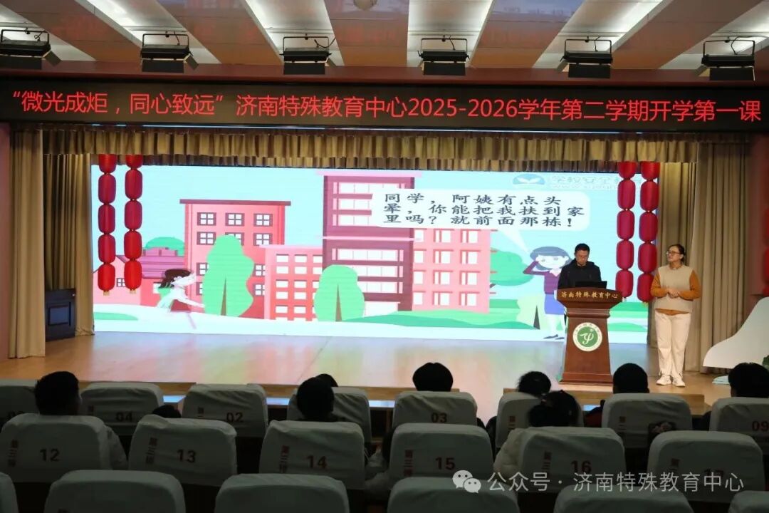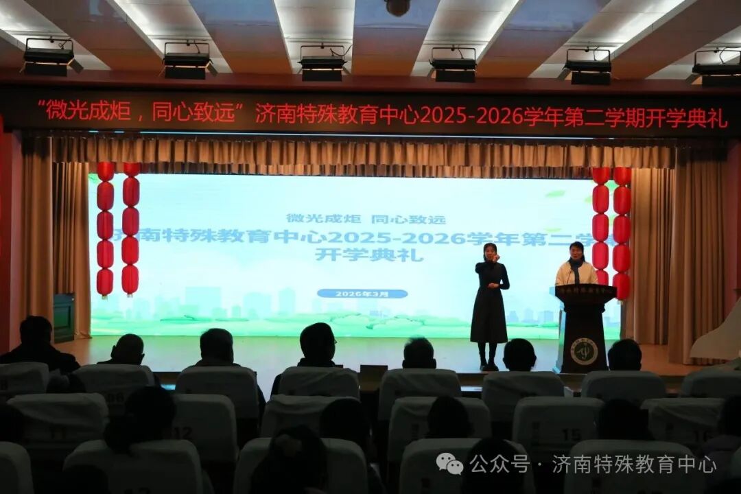 2026年3月5日,济南特殊教育中心以“微光如炬,同心致远”为主题,举行2025-2026学年第二学期开学典礼暨开学第一课。全体师生齐聚演播大厅,责任督学范心胜、邢庆福到校参加开学典礼,共同迎接新学期的到来,在春日校园里种下希望与奋进的种子。