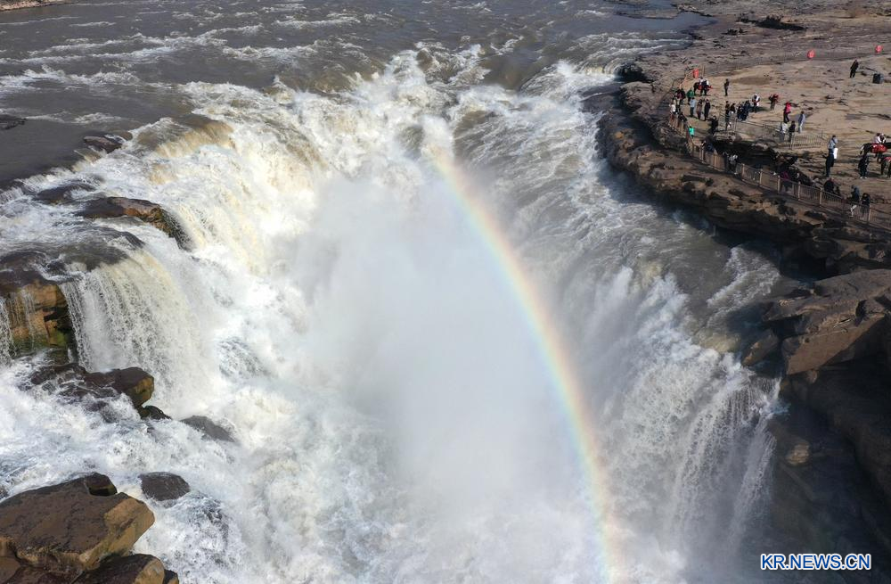 이날 황허 후커우 폭포 관광지를 둘러보고 있는 관광객들을 드론으로 담았다. 2026.3.5