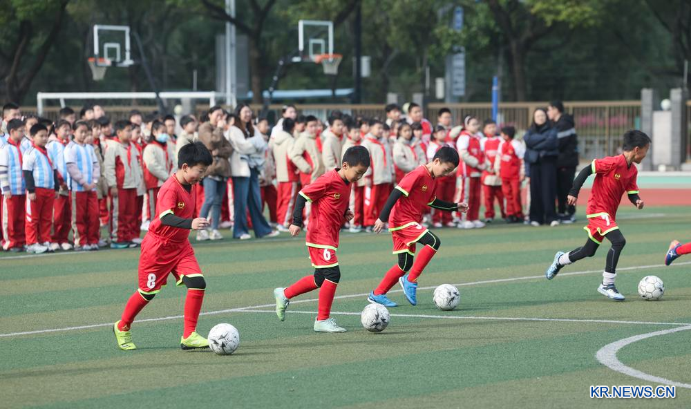 5일 자싱시의 한 초등학교에서 개학 첫 수업으로 축구 연습이 이뤄지고 있다. 2026.3.5