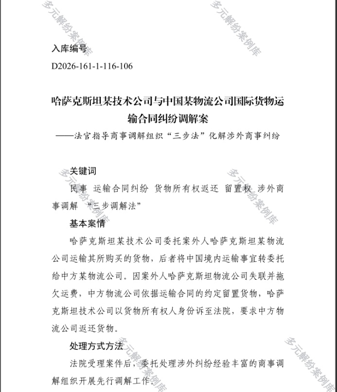 本案系一起典型跨境货物运输合同纠纷。哈萨克斯坦企业委托境外物流公司运输货物,该公司转委托青岛某物流公司承运境内段运输。因境外中间方失联拖欠运费,青岛物流公司依法留置货物,哈方企业以货物所有权人身份诉至法院请求返还货物,双方围绕货物返还与留置权合法性形成争议。案件受理后,法庭依托多元解纷机制,先行引入商事调解组织开展调解,在调解组织初步沟通、厘清基本诉求的基础上,承办法官及时跟进、深度介入,坚持把非诉讼纠纷解决机制挺在前面,践行“调解优先、利益兼顾”理念,严格依照《中华人民共和国民法典》相关规定,精准梳理法律关系与争议焦点。承办法官采取“背对背释法析理、面对面协商谈判”方式,向双方明晰权利边界与风险后果,针对企业核心诉求量身设计“两步走”“三步调解法”工作方案,引导双方搁置第三方争议,聚焦货物交付与运费保障达成共识。承办法官充分发挥国商法庭创建的“尚合调解”品牌优势,融合调解组织先期疏导与司法专业把关,经多轮细致调解,中外企业最终达成“继续运输+费用直付+长期合作”一揽子调解协议,并当庭履行。青岛物流公司当日恢复运输,将货物安全送达指定目的地;哈方企业直接支付运费,有效避免贸易违约与损失扩大,实现案结、事了、人和、货通,以最小成本、最高效率畅通跨境物流供应链。
