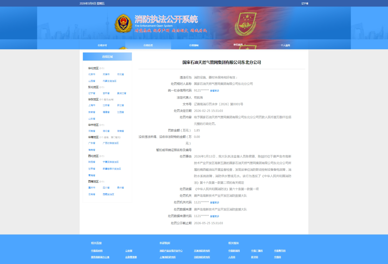 齐鲁晚报·齐鲁壹点记者于消防执法公开系统获悉,2月25日,国家石油天然气管网集团有限公司东北分公司(下称“国家管网集团东北分公司”)收行政处罚决定书,其违法行为是“消防设施、器材未保持完好有效”,处罚机关为葫芦岛高新技术产业开发区消防救援大队。