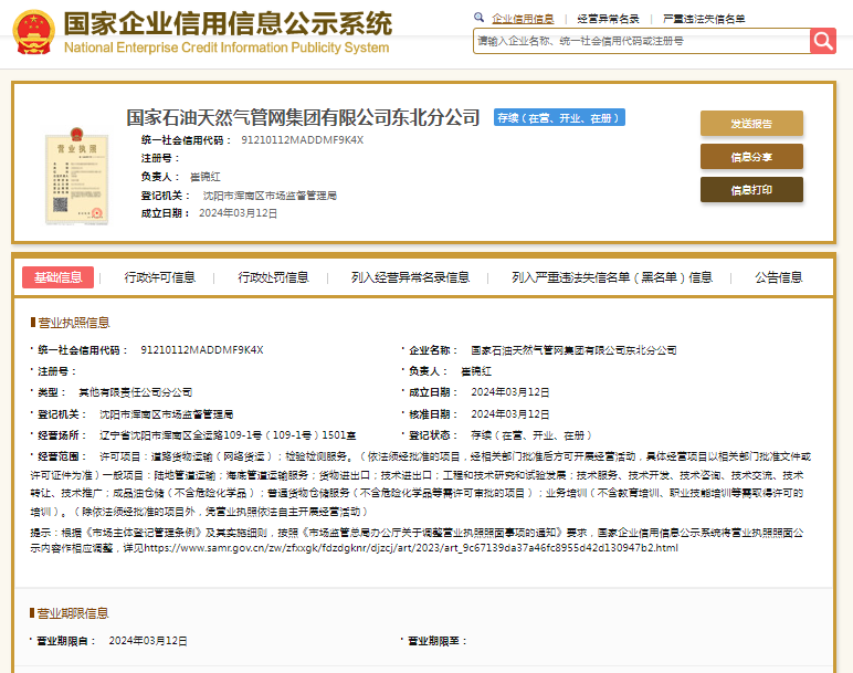 国家企业信用信息公示系统显示,国家石油天然气管网集团有限公司东北分公司成立于2024年,负责人崔锦红。其母公司——国家石油天然气管网集团有限公司则成立于2019年,注册资本50000000万元人民币,法定代表人张伟。