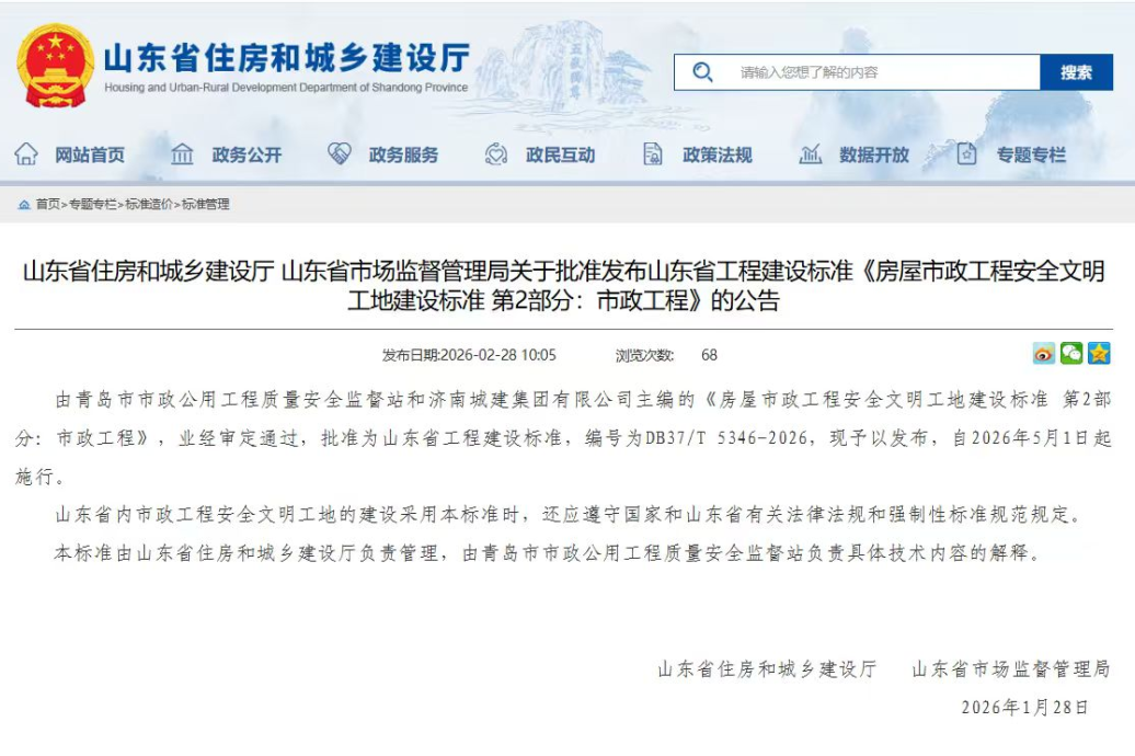 近日,由市市政公用监督站主编的山东省工程建设标准《房屋市政工程安全文明工地建设标准 第2部分:市政工程》(DB37/T5346-2026)业经审定通过,已批准发布,自2026年5月1日起施行。该标准的发布,标志着我市在市政公用工程标准化建设领域再获突破,将为全省市政工程安全文明施工管理提供科学指引和规范依据。