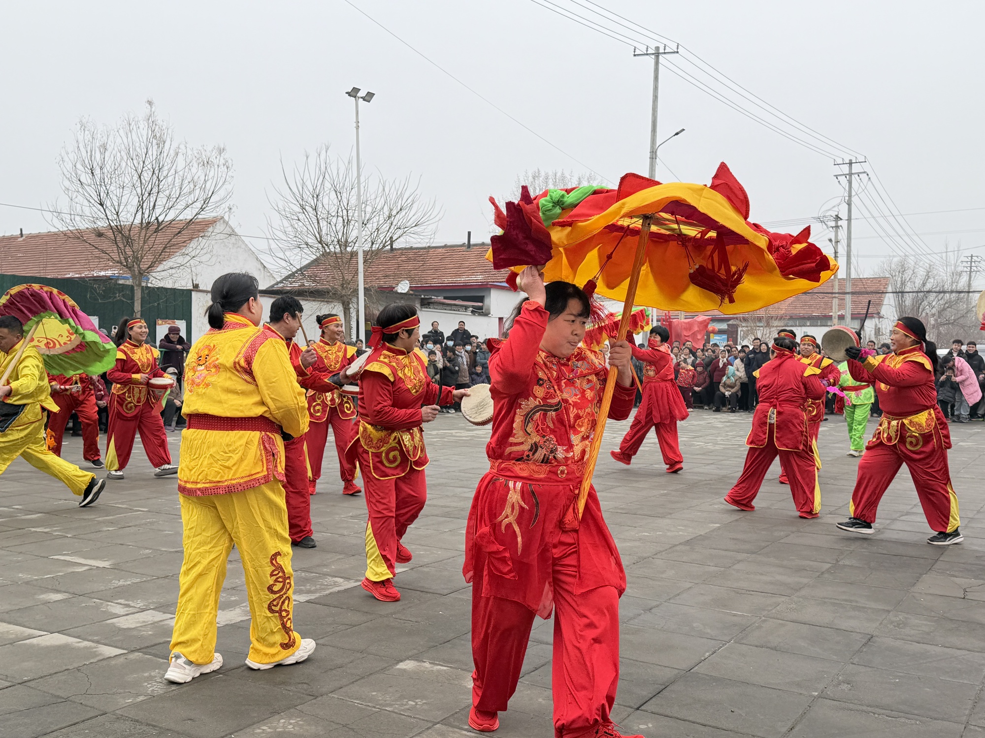 下午两点,伴随着激昂的锣鼓声,秧歌队员身着喜庆服饰,手持彩扇、花伞、鼓棒,精神抖擞地跑起场子。队员们步伐矫健、鼓点铿锵,“伞”“鼓”“棒”“花”各展风采,粗犷豪放的表演生动展现了鲁北女性的飒爽英姿,赢得阵阵喝彩。