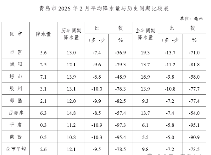 与历年同期相比,各区(市)均偏少,平度、莱西偏少9成以上,即墨偏少8成以上,城阳、胶州偏少7成以上,西海岸、市区偏少5成以上,崂山偏少4成以上。截至2月末,今年以来全市平均降水量5.4毫米,比历年同期偏少15.6毫米(74.3%),比去年同期偏少5.6毫米(50.9%),列1952年有水文统计资料以来历史同期从小到大第12位,降水偏少。与历年同期相比,各区(市)均偏少,平度、莱西偏少8成以上,即墨、城阳、胶州偏少7成以上,市区、西海岸、崂山偏少6成以上。