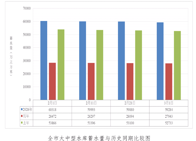 2月末,全市23座大中型水库(不含棘洪滩)蓄水59284万立方米,比历年同期多蓄31341万立方米,比去年同期多蓄6551万立方米,较月初少蓄1034万立方米,列1960年有水文统计资料以来历史同期第1位。