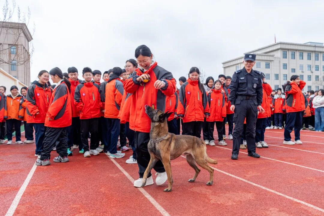 在警犬训导员的带领下,学生代表与警犬“皮特”近距离互动,抚摸、合影。