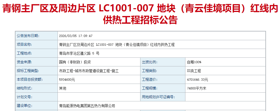 近日,青钢主厂区及周边片区 LC1001-007 地块(青云佳境项目)红线内供热工程招标公告发布,工程地点位于李沧区遵义路 5 号,建设单位为青岛能源热电集团第五热力有限公司。