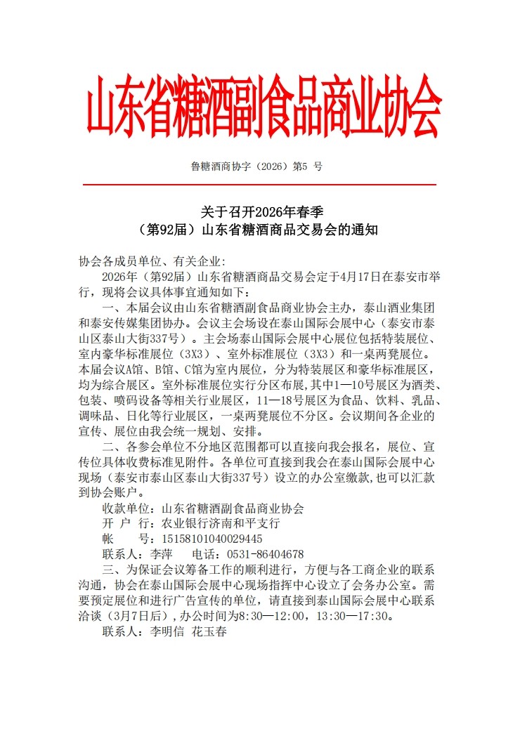 4月17日,2026年春季(第92届)山东省糖酒商品交易会将在泰山国际会展中心开幕。对于参展商而言,这是一次开拓新市场、完善新渠道的尝试;对于行业而言,这是一次观察区域糖酒会转型的窗口;而对于泰安而言,这是一次会展经济与文旅经济融合的机遇。