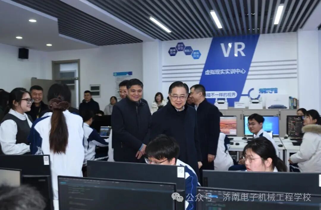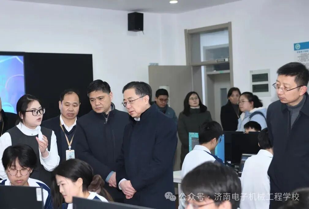 升旗仪式结束后,济南市委教育工委常务副书记,市教育局党组书记、局长王纮一行深入教室、餐厅和学生宿舍,详细了解学生在校学习生活情况。随后,实地参观了学生大课间活动及虚拟现实、电子商务、数字媒体等专业的“双主导”情景实训课。在对学校各项工作给予肯定的同时,王纮寄语学校继续深化改革,聚焦市场需求和学生发展,提升办学品质,为省会经济社会发展培养更多高素质技术技能人才。