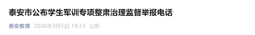 3月5日,泰安教育微信公众号发布消息,泰安市公布学生军训专项整肃治理监督举报电话,具体如下: