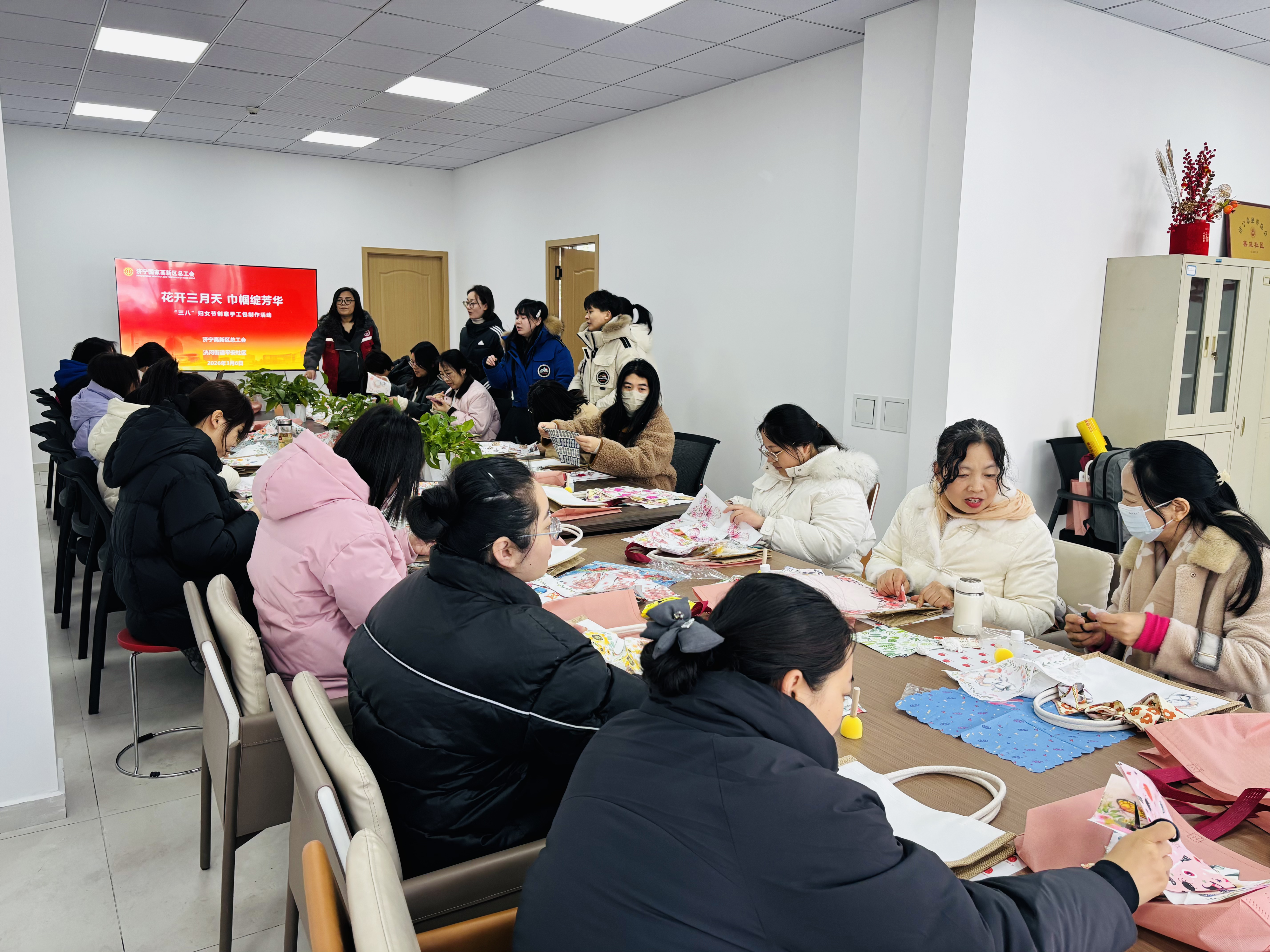 为庆祝“三八”国际妇女节,3月6日,济宁高新区洸河街道平安社区联合济宁高新区总工会精心举办“花开三月天 巾帼绽芳华”碟古巴特包包手工制作活动。