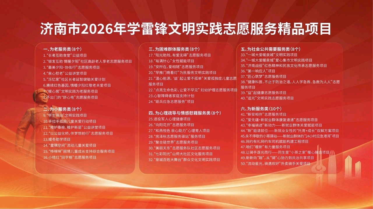 活动现场发布了六大类共50个济南市2026年学雷锋文明实践志愿服务精品项目,推出了全市学雷锋主题月“爱心集市”活动计划,以及“益路天桥”文明实践志愿服务活动计划和“新安相伴”等特色志愿服务项目。同时,山东中医药大学爱无疆残疾人服务中心还推出了服务新就业群体的“爱无疆·新就业群体康复速递”志愿服务项目。