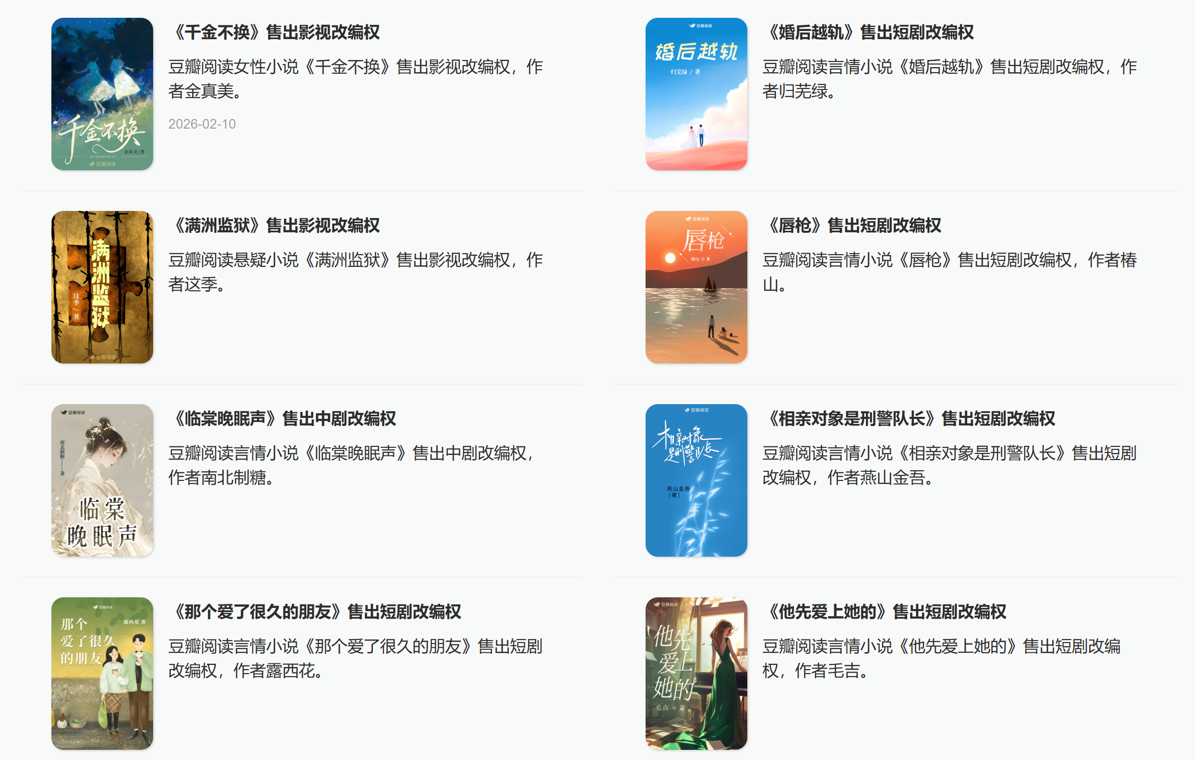 公开数据显示,2026年至今两个多月的时间里,豆瓣阅读已累计售出14部作品的影视版权,其中短剧占据10部,包括《唇枪》《他先爱上她的》等。