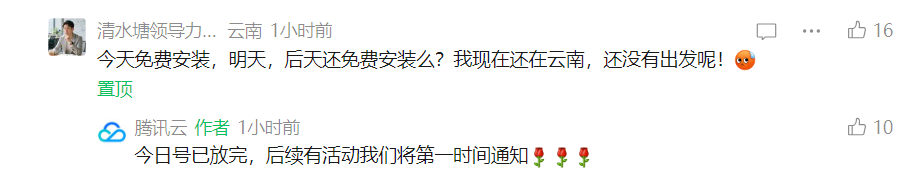 该文下方有网友评论:今天免费安装,明天,后天还免费安装么?我现在还在云南,还没有出发呢!腾讯云回复:今日号已放完,后续有活动我们将第一时间通知。