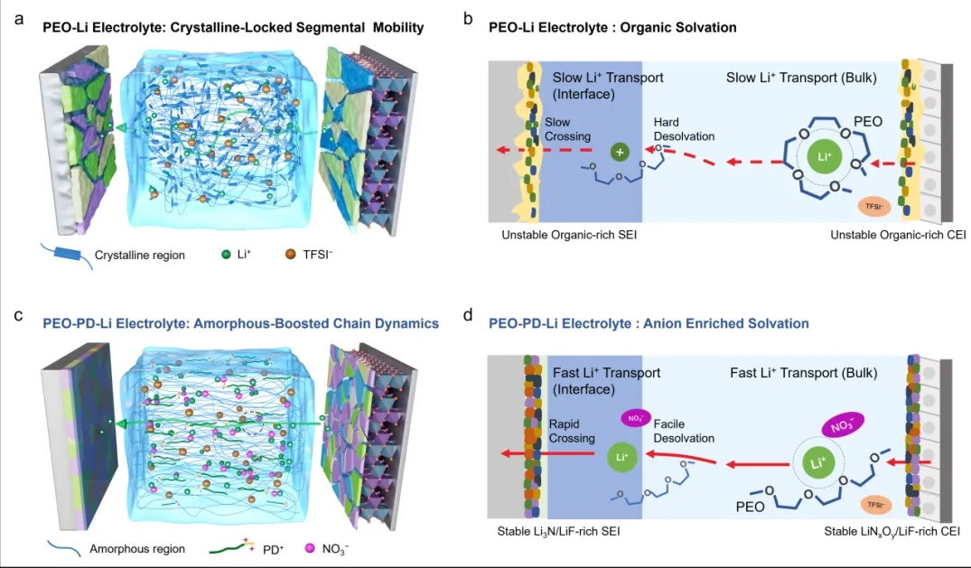 王璐副教授介绍,在众多固态电解质材料中,PEO是最受关注的电解质基质之一。它像一张柔韧的高分子网,能够有效溶解锂盐并传导锂离子,兼具柔性和加工性。然而,这张“网”有个致命的短板,即室温下离子“跑得太慢”,一遇上高压正极就容易“罢工”。具体来说,PEO电解质长期面临室温离子电导率低、高压正极兼容性差(超过4V易氧化分解)、循环稳定性不足等三重挑战。