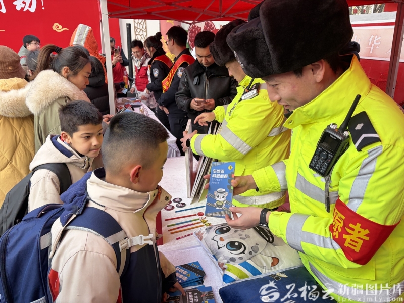 交警为学生讲解交通安全知识。石榴云/新疆日报记者 吕伊晗摄