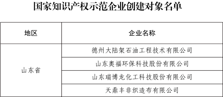 此次入选的4家企业分别为德州大陆架石油工程技术有限公司、山东奥福环保科技股份有限公司、山东瑞博龙化工科技股份有限公司、天鼎丰非织造布有限公司,涵盖石油工程技术、环保装备、精细化工、非织造材料等多个重点产业领域,在关键核心技术攻关、新质生产力培育等方面取得明显成效。国家知识产权示范企业是知识产权强国建设的重要载体,是衡量企业核心创新能力、市场竞争力与行业引领力的标杆。入选企业代表着企业知识产权创造、运用、保护、管理的先进水平,是推动产业升级、破解“卡脖子”技术难题、引领行业创新发展的中坚力量。