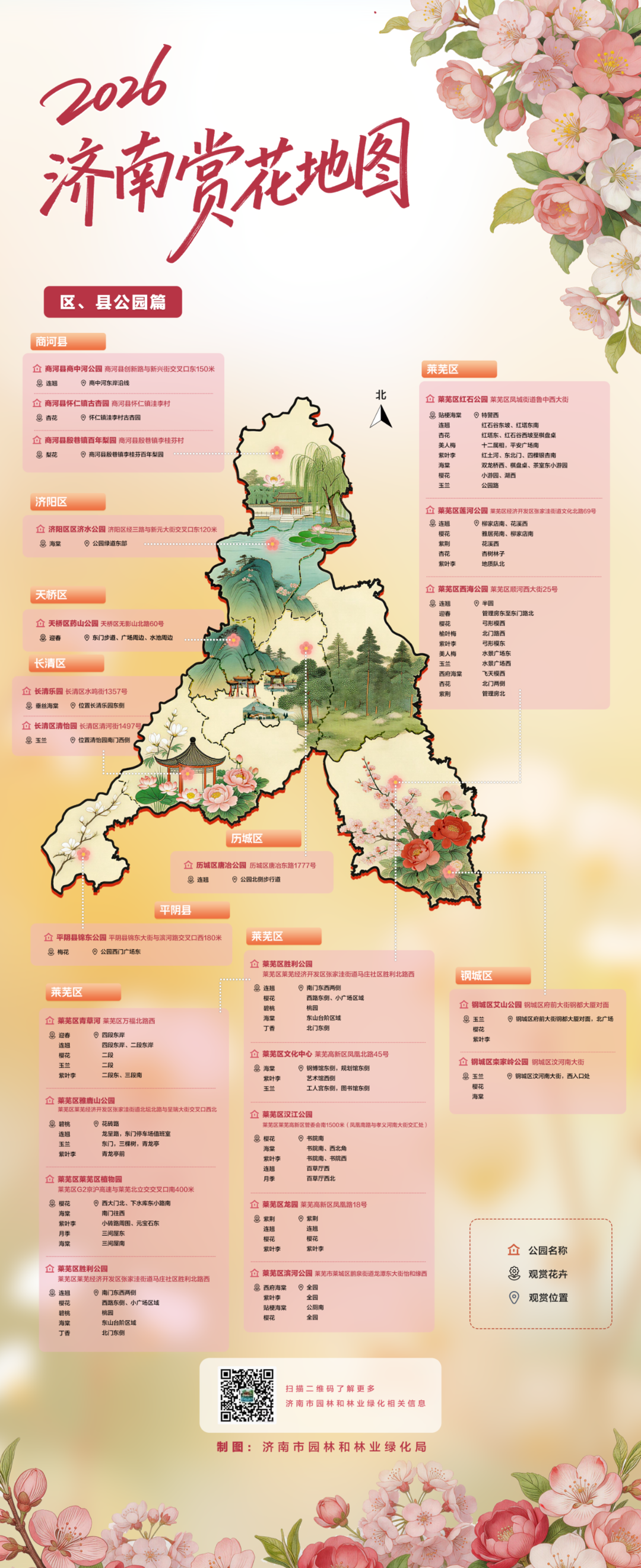 3月5日,济南市园林和林业绿化局发布2026济南赏花地图——区、县公园篇。区、县公园赏花推荐天桥区历城区长清区济阳区莱芜区钢城区平阴县商河县